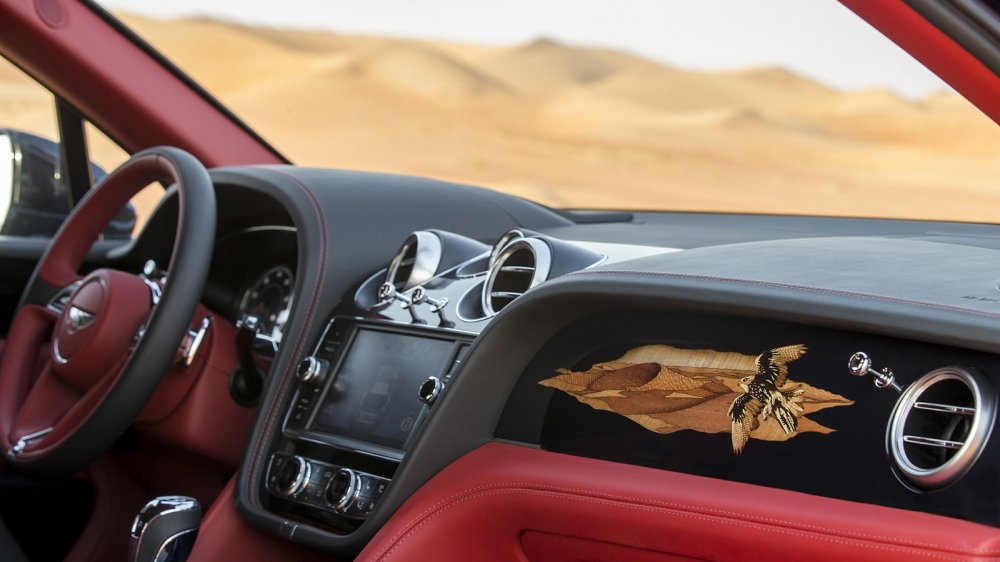 Салон кроссовер оборудован съёмным насестом для транспортировки и привязью на центральном подлокотнике, но куда с большим вдохновением в Бентли рассказывают о мозаичном изображении сокола-балобана в технике маркетри.