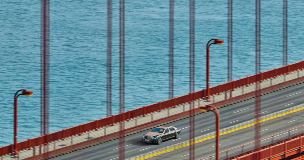 Английский автопроизводитель подошёл к продвижению своей модели весьма необычно — при постепенном увеличении масштаба фотографии моста "Золотые ворота" на ней появляется новый Mulsane EWB. И не просто появляется — его можно рассмотреть в мельчайших деталях.
