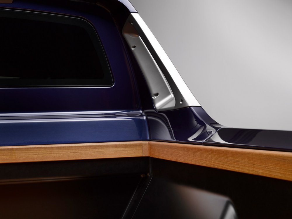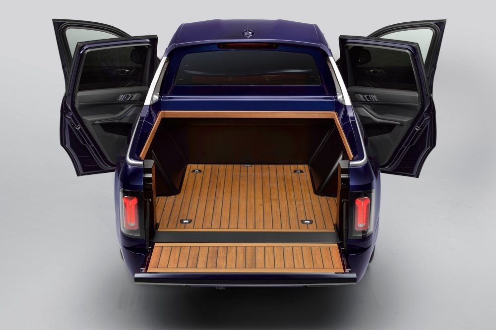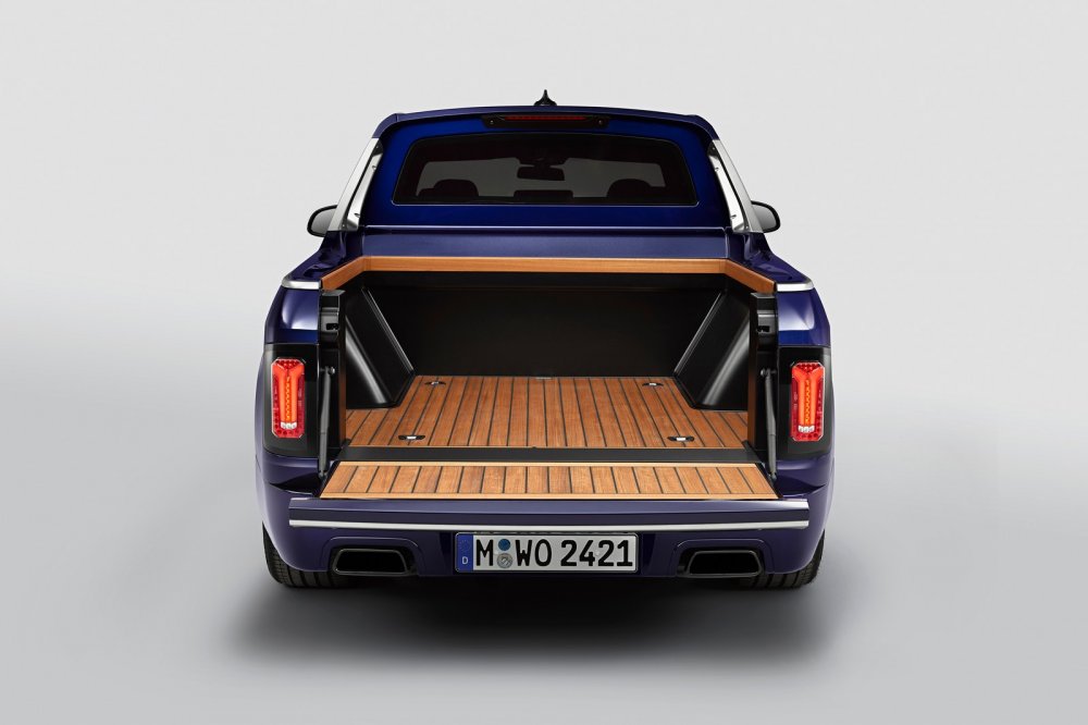 Грузовую площадку длиной 140 см (или 200 см с откинутым бортом) отделали тиковым деревом, словно палубу яхты, а механизм сочленения прикрыли пластиной из углепластика. Выглядит такой декор здорово, вот только серьёзный груз на него не поставишь – жалко повредить красоту. Немудрено, что под мотоцикл BMW F 850 GS, который поместили в кузов для фотосессии, подложили защитную металлическую планочку. И вообще, любой владелец яхты, отделанной тиковым деревом, скажет вам, что ходить по палубе в обуви строго запрещено – только босиком.