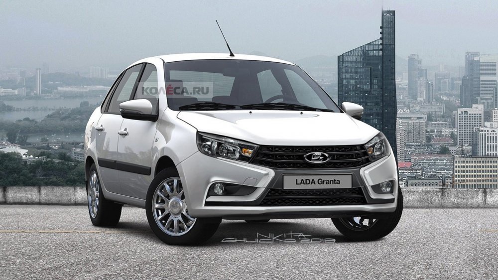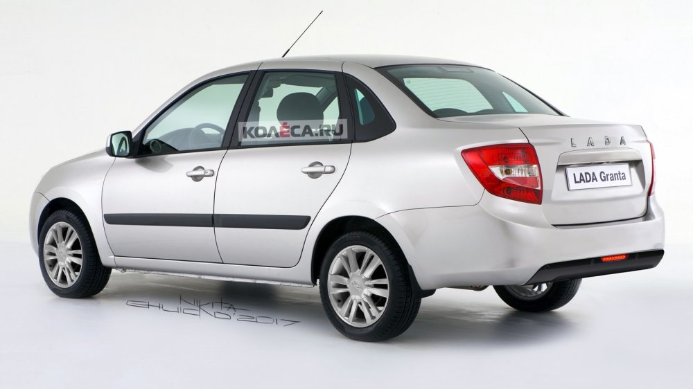 Далее следует целая россыпь новинок АВТОВАЗа, значительную часть которых составляет обновлённое семейство Гранта. Начнём с седана, рендеры которого мы делали два раза. Первые изображения были готовы в начале лета 2017 года, когда только появилась первая информация о возможном обновлении и ещё не было никаких шпионских фотоснимков. Тогда нам удалось угадать решение задней части седана с новой крышкой багажника. Когда конкретики стало больше, мы сделали новые рендеры и более точно воспроизвели переднюю часть автомобиля.