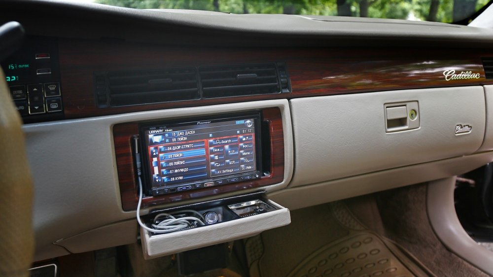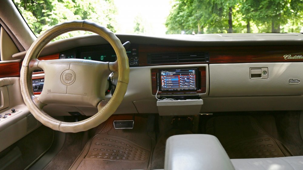 Кстати, наш ДеВилль – далеко не топовый, в списке опций имелись также датчики дождя и современный многофункциональный ключ, с которого отдельными кнопками включался свет в салоне, открывались двери или багажник. Зато у этой машины в списке штатного оборудования был проигрыватель-кассетник, ныне уступивший место современной аудиосистеме (к счастью, имплантированной довольно-таки деликатно).