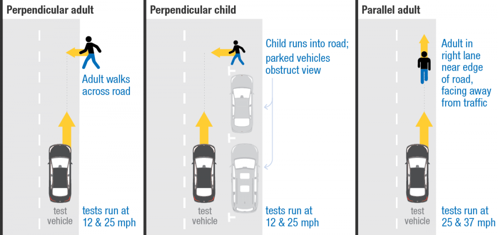 Ежегодно в США на автодорогах гибнут порядка шести тысяч пешеходов, и специалисты IIHS решили проверить, как современные кроссоверы способны решить эту проблему, ведь автопроизводители всё время рапортуют о внедрении передовых систем распознавания помех, в том числе пешеходов, велосипедистов и животных. На тест собрали одиннадцать массовых компактных (по американским меркам) паркетников, снабжённых такими системами на конвейере. Программа испытаний включала в себя три типовых сценария:
