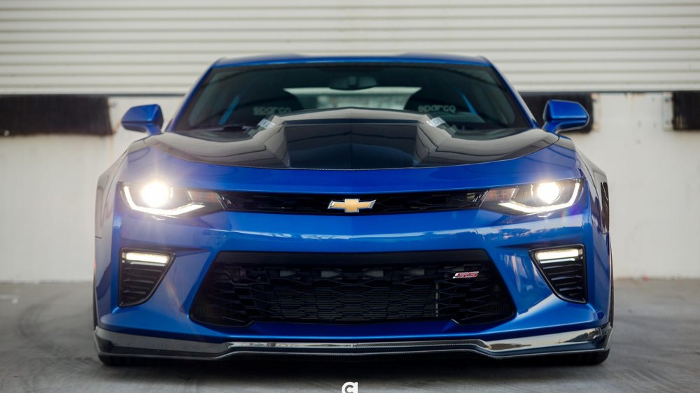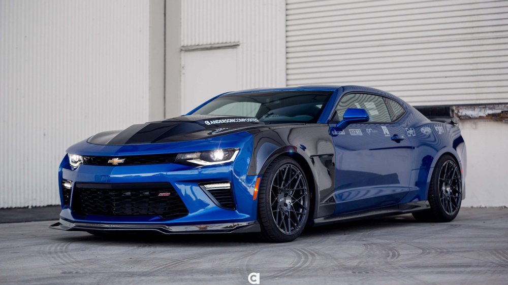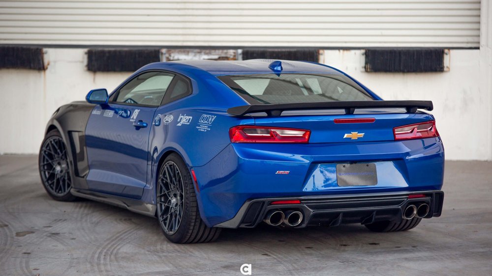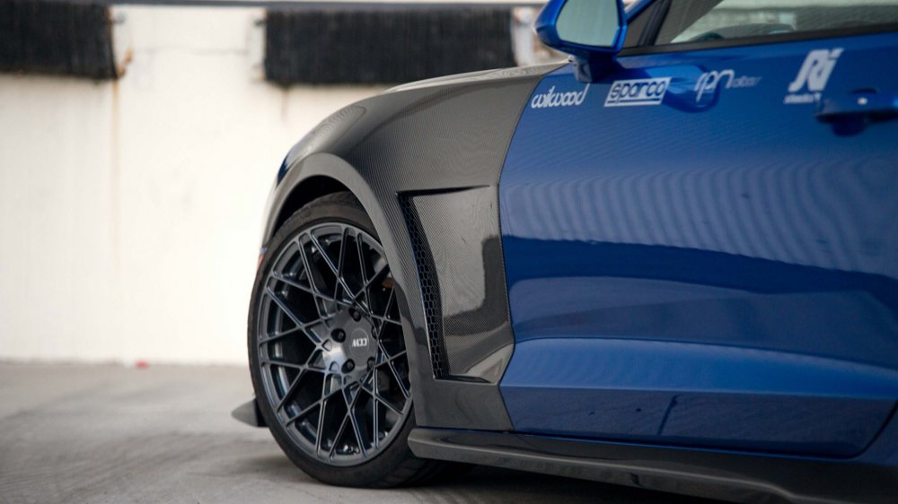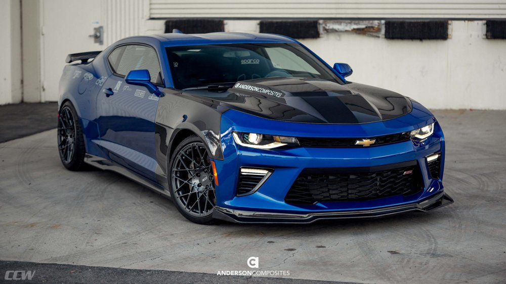 Сочетание стандартного синего окраса кузова и карбоновой текстуры придают Camaro SS крутой внешний вид, подчеркиваемый комплектом новых 19-дюймовых колес CCW Concave CVM10, обутых в резину Continental ExtremeDW.