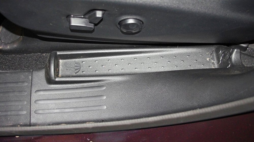 Доступ в салон, естественно, бесключевой, но, распахнув водительскую дверь, я не спешу занимать водительское место… Около кресла, под левой рукой — ниша с обозначением зонтика. Мужик бы до такого точно не додумался, да и ширина отсека сделана уж под совсем изящный аксессуар. Впрочем, какое-нибудь телескопическое орудие защиты или селфи-палка улягутся там как влитые.