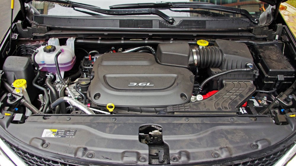 Понять, запущен ли наш 279-сильный бензиновый Pentastar V6 образца 2013 года, не посмотрев на приборную доску, весьма сложно. На холостом ходу мотора практически не слышно, и дело не столько в самом двигателе, сколько в качественной «шумке» моторного отсека.