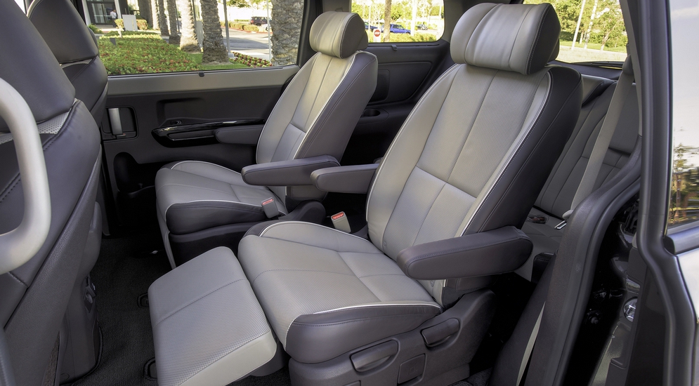 Представитель южнокорейского автопрома — прямой наследник минивэна Kia Carnival, известного с 1998 года, а в некоторых странах модель называется так и сегодня. Третье поколение, дебютировавшее сравнительно недавно, в 2014 году, в Россию не пришло, а жаль: внушительный, мужественный облик мог бы найти у нас немало приверженцев. Ведь внешне Sedona здорово напоминает Kia Sorento Prime, и неспроста: модели имеют общую платформу, хотя у минивэна база почти на 30 см больше, чем у кроссовера, да и полного привода нет, только передний. Шестицилиндровый корейский двигатель — самый «малолитражный» в нашем обзоре, но отдача у него вполне приличная: по мощности Kia уступает только Крайслеру. Однако ступеней у «автомата» — шесть, как у Хонды, а масса даже чуть больше: это главный тяжеловес нашего обзора. Что же касается удобств, то тут можно отметить «умную» пятую дверь, которая может подниматься сама, стоит владельцу с ключом в кармане на несколько секунд задержаться около машины: очень удобно, если руки заняты, и ногами размахивать не нужно.