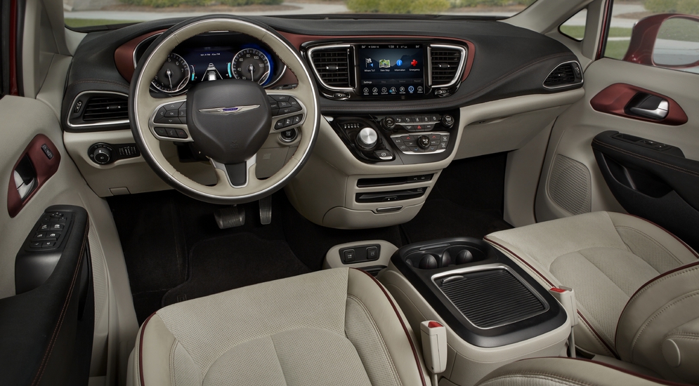 В Штатах стартовая цена Chrysler Pacifica составляет 28 600 долларов — это на 1 400 долларов меньше, чем у Town&Country, но на 5 200 долларов больше, чем у Jeep Cherokee. Если взять за основу стоимость данных моделей у нас, грубая прикидка дает рублевую цену Пасифики порядка 2,9 миллиона, — немало, но, как говорится, есть за что. Начальная версия LX укомплектована 17-дюймовыми легкосплавными колесными дисками с датчиками давления в шинах, кондиционером, адаптивным круиз-контролем, мультимедийной системой Uconnect с пятидюймовым дисплеем и шестью динамиками, камерой заднего вида, системами бесключевого доступа и активного шумоподавления, полным комплектом средств безопасности, электроприводом всех стеклоподъемников и водительского кресла. Но кожаные сиденья и колеса большего диаметра — либо опции, либо атрибуты более дорогих версий, равно как и светодиодная оптика, электропривод сдвижных задних дверей и сидений второго и третьего рядов, трехзонный климат-контроль, подогрев и вентиляция сидений, а также навигация с большим монитором и премиальная аудиосистема Harman Kardon с двадцатью динамиками. И, конечно же, пульт дистанционного открывания ворот гаража.