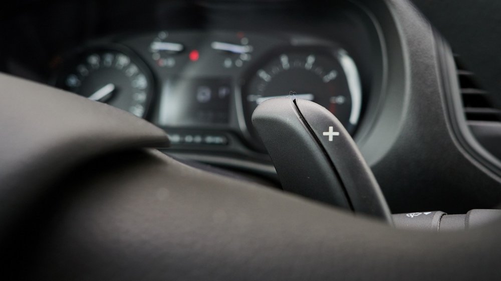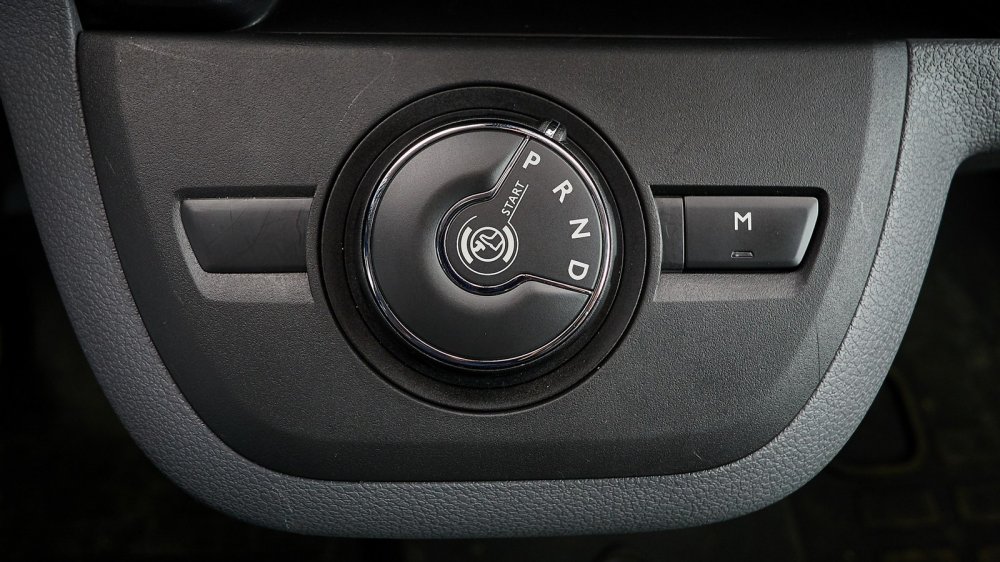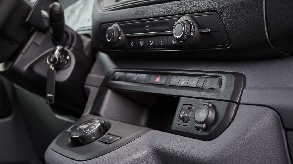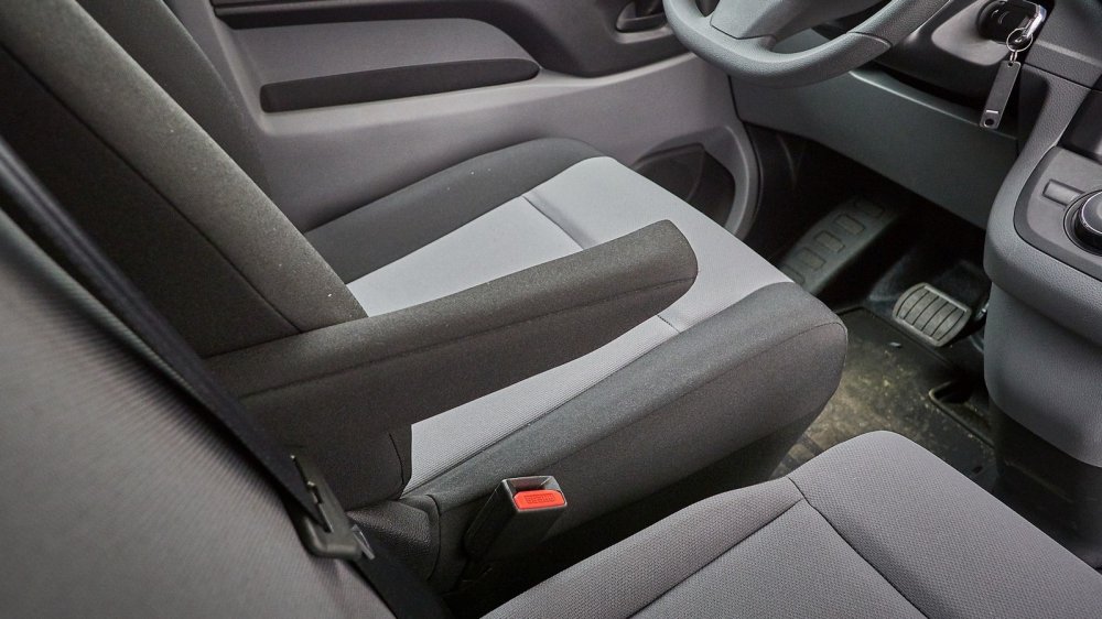 Сделав пару кругов вокруг машины и покинув грузовой отсек, усаживаюсь в кресло, обитое простецкой серой и черной тканью. Правая рука сразу ложится на подлокотник, а глаз тем временем дарит мозгу две мысли. Первая – почему пассажирский диван так обделили длиной подушки, а вторая – сколько места можно было бы сэкономить, отказавшись от МКПП и трансмиссионного тоннеля и перенеся управление «автоматом» под руль, как на легковых Citroen — уж слишком одиноко и монументально выглядит красивая шайба, вынесенная на отдельный «подиум» посередине. Однако мозгу, разумеется, ясно, что эта мысль не может быть ничем подкреплена, ибо без «механики» в этом сегменте не обойдешься – ну а двухместный диван с короткой подушкой при желании можно заменить индивидуальным сиденьем, которое будет немногим скромнее водительского.
