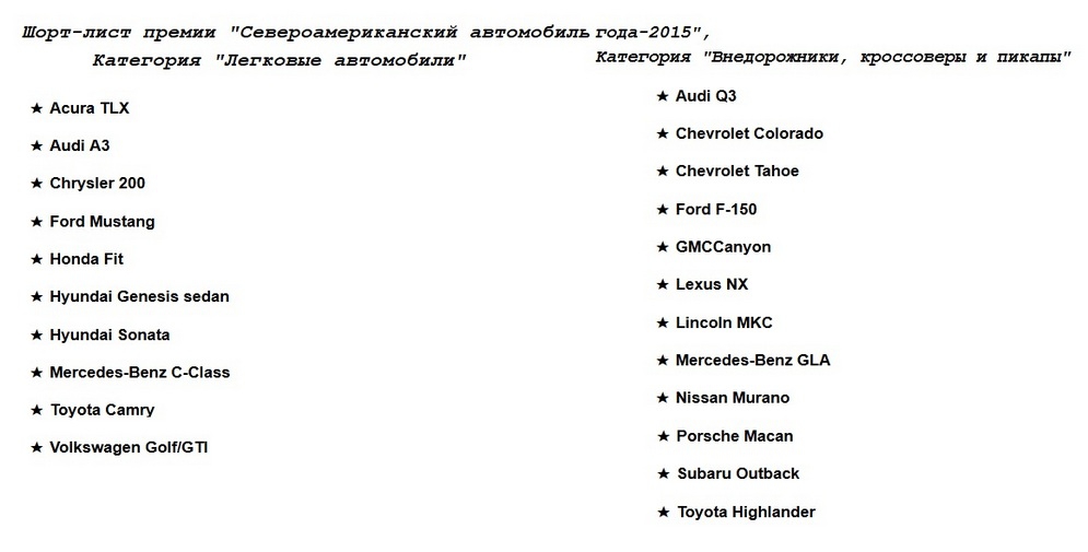 Оргкомитет конкурса "Североамериканский автомобиль и внедорожник года" опубликовали шорт-лист претендентов на почетное звание.