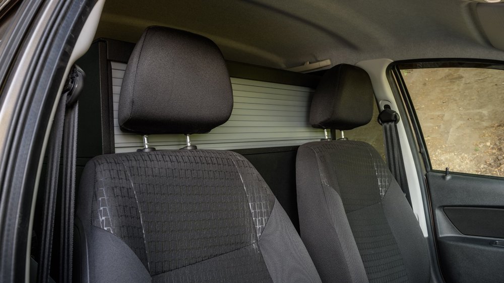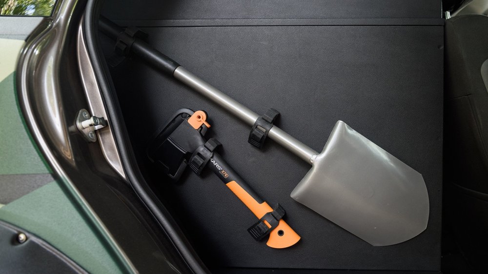 Масштабные изменения произошли в салоне. Заднего дивана у "экспериментального" mi-DO нет. Высвобожденное пространство было использовано для установки большого бокса с ящиками для хранения вещей и выдвижным столом. Автомобиль укомплектовали комплектом тросов, раскладным тентом, походными лопатами и топором, а также холодильником на 20 литров.