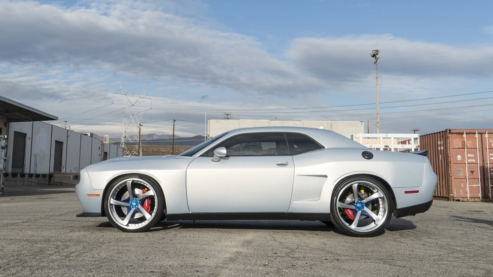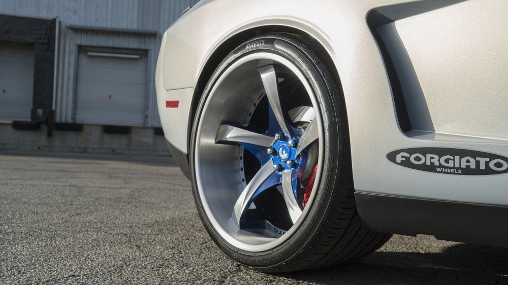 Судя по фото, комплект серебристых дисков от Forgiato как раз то, что нужно Challenger SRT. Модель Appunito-ECL с синими акцентами подчеркивает дикий нрав автомобиля. За дисками просматриваются большие вентилируемые тормоза Brembo и красные суппорты. Сами 20-дюймовые диски «обернули» в резину Pirelli P Zero Nero.