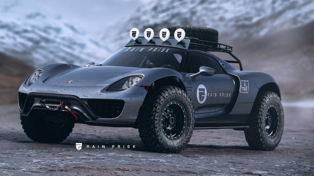 И надо отдать дизайнеру должное — результаты получились чертовски хороши. Первым во внедорожную амуницию эстонец нарядил Porsche 918 — автомобиль, который, казалось бы, представить в форм-факторе короля бездорожья можно лишь в измененном состоянии сознания. Porsche 918 получил увеличенный клиренс, усиленный трубами каркас, большие колеса с внедорожными покрышками. Ну и лебедка, как же без нее — главный атрибут для любителей проехать там, где и пройти не всегда получится.