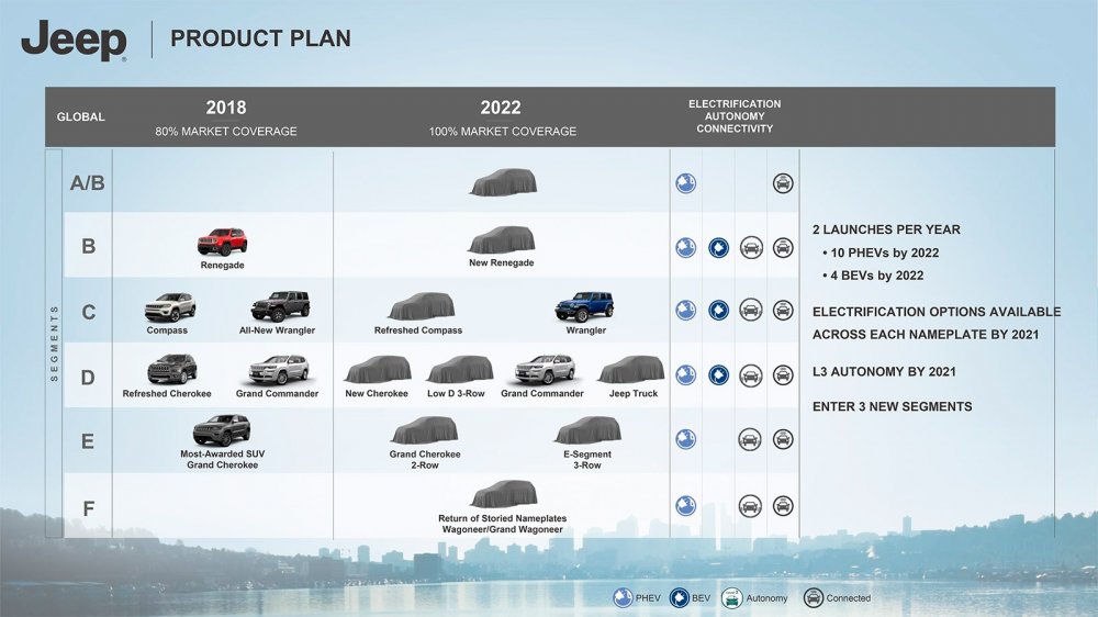 Кроме того, укреплению позиции компании в кроссоверно-внедорожном сегменте должен способствовать выпуск к тому же 2022 году целых 11 новинок, которые должны полностью закрыть все рыночные ниши: пока у Jeep нет ультракомпактной модели в сегменте А и большого внедорожника в сегменте F. Китаю традиционно обещают две эксклюзивных модели, а на Северную Америку будет нацелен огромный Grand Wagoneer, с помощью которого в том числе планируется поднять показатели чистой прибыли. На США, разумеется, есть огромные надежды: Jeep здесь – сильнейший бренд концерна, и за 5 месяцев 2018 года только его продажи показали ощутимый рост в 22,5% к показателю прошлого года, составив 408 тысяч штук.