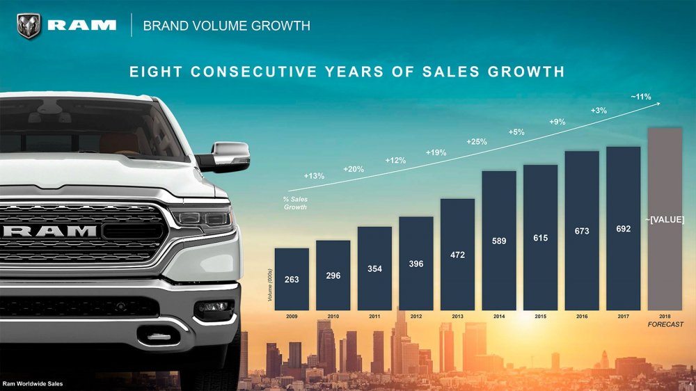 Еще один «столп» FCA в Америке – это, разумеется, RAM: в компании с Jeep и Dodge он составляет основу продаж концерна. Несмотря на то, что пока в первые 5 месяцев этого года продажи составили 208 тысяч штук, что почти на 10% меньше показателя прошлого года, в FCA показывают график за последние 10 лет, где RAM демонстрирует стабильный и последовательный рост, и рассчитывают, что в 2018 нарастят продажи на целых 11%, превысив отметку в 700 тысяч проданных машин. К слову, не стоит забывать, что в модельной линейке RAM есть не только пикапы, но и коммерческая техника: легкий фургон Promaster City и перелицованный Fiat Ducato, носящий имя Promaster. К 2022 году неизменным в линейке должен остаться только последний, в то время как и легкий фургон, и линейка пикапов должны пережить масштабное обновление, а среднеразмерный пикап – еще и получить гибридную версию.