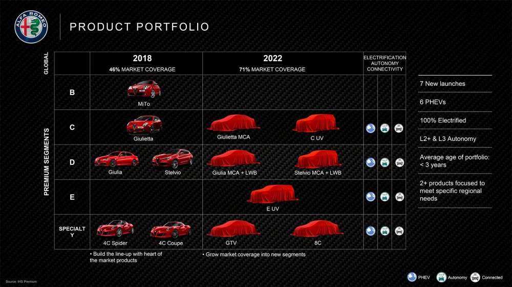 Не менее грандиозные планы и у премиальной Maserati: вдохновленные ростом продаж, который обеспечил итальянцам кроссовер Levante, они полны решимости запустить новый среднеразмерный кроссовер и уже заранее возлагают на него долю в 26% от общих продаж марки. Благодаря ему, а также еще одному обещаемому крупному кроссоверу и новому купе Alfieri итальянцы рассчитывают удвоить мировые продажи: если в 2017 году они достигли отметки в 50 тысяч штук, то к 2022 они должны превысить 100 тысяч, обеспечив прибыль в 15%. Разумеется, в премиум-сегменте отказ от дизелей и развитие электрических технологий звучат еще более четко: это не только гибридные версии моделей, но и чистые электромобили. Однако помимо 4 запланированных «батареечных» моделей немалый интерес представляет гибридное купе (та самая Alfieri), для которого обещают 300 км/ч максимальной скорости и ускорение «в районе 2 секунд» до первой сотни.