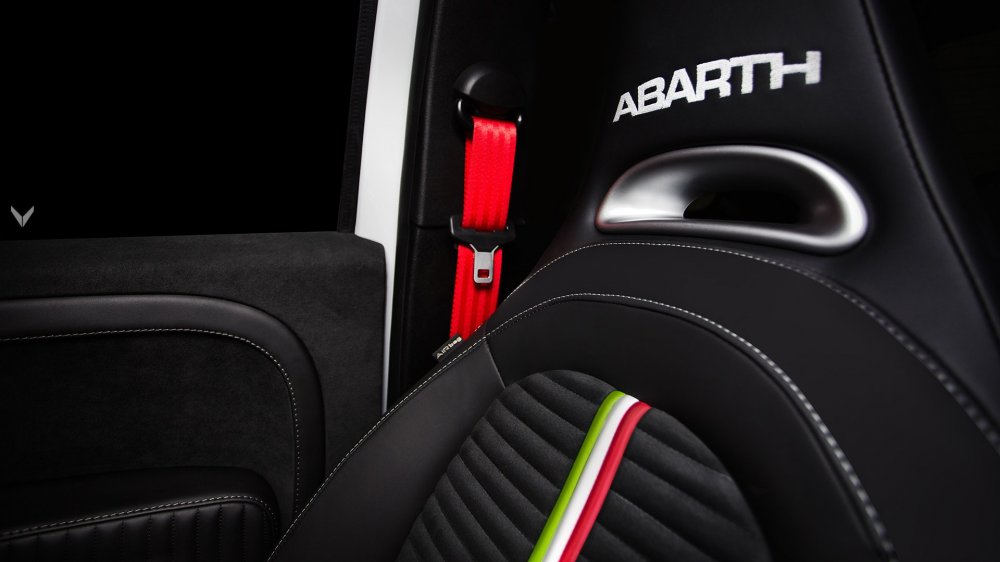 Помимо полосы итальянского флага, кузов автомобиля получил еще несколько дополнительных «оспортивливающих» элементов – графика на дверях, полоса с надписью Abarth в верхней части лобового стекла, а на задний спойлер нанесена текстура красно-белого клетчатого флага. Последний элемент отлично сочетается с опциональной выпускной системой Record Monza Abarth.