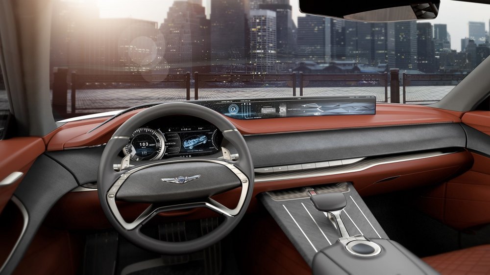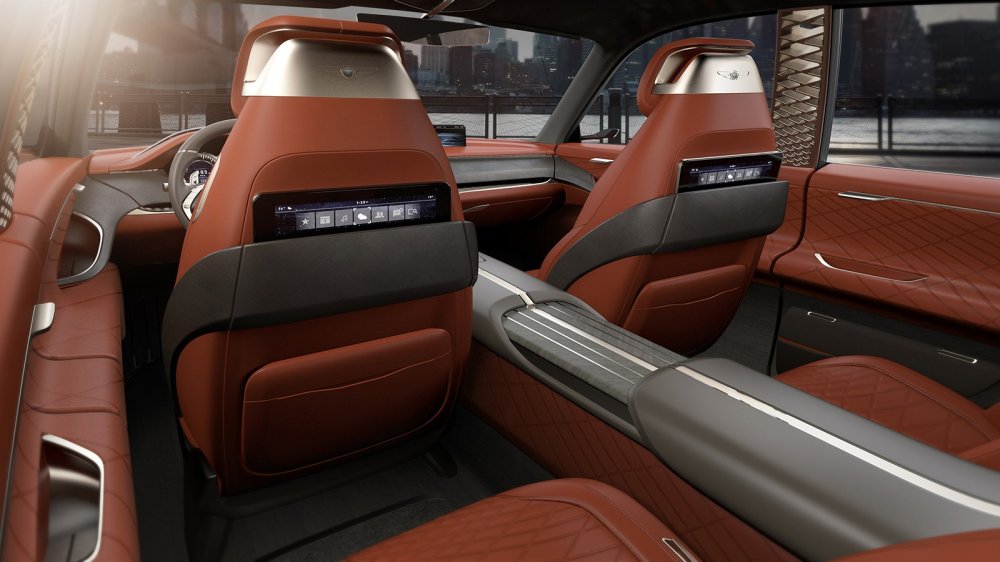 Интерьер концептуального Genesis GV80 лаконичен, прост и человекоориентирован. Не совсем понятно, почему в Genesis говорят о диагонали сенсорной панели в 22 дюйма, когда автомобиль имеет два разных дисплея. Два задних кресла разделены довольно высоким тоннелем пола, пассажирам положено по отдельному планшету.