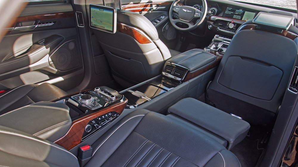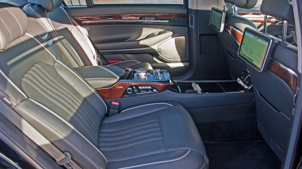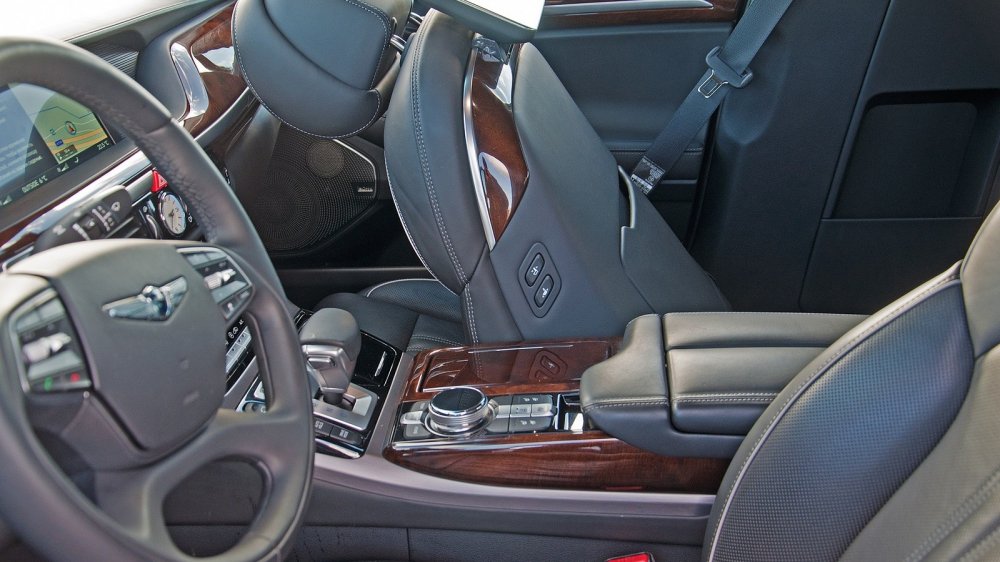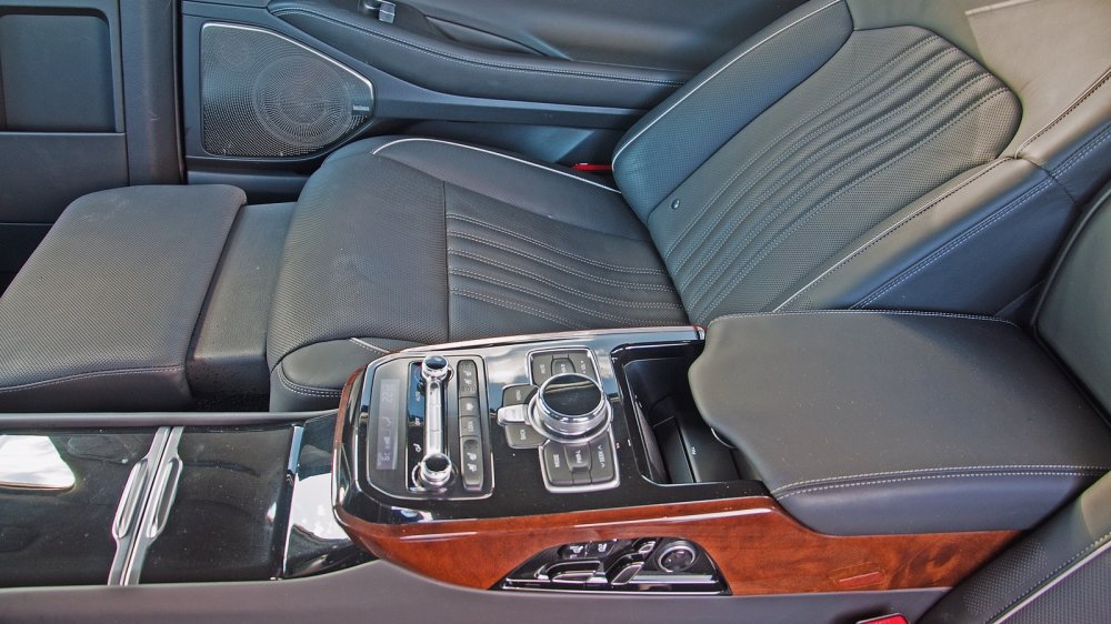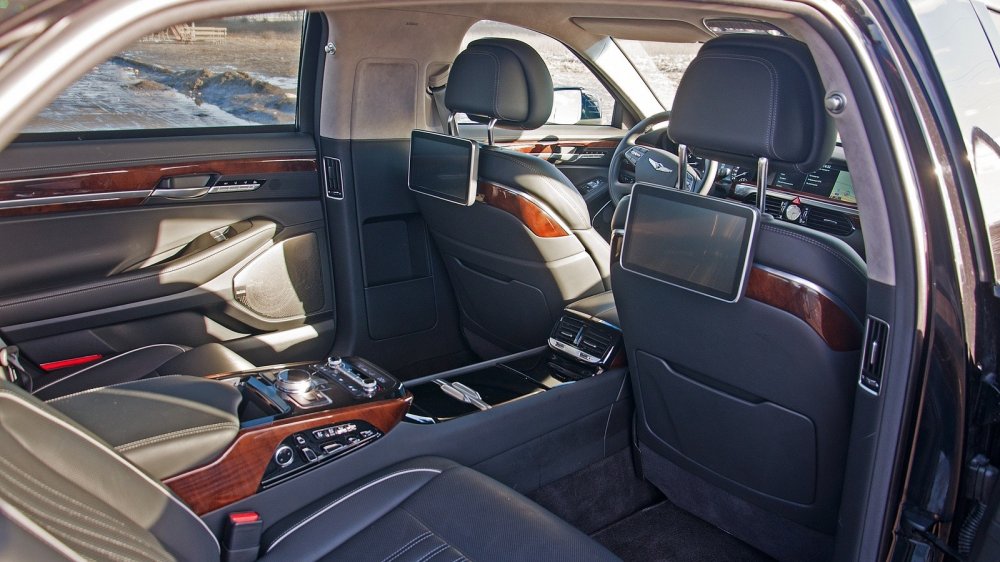 Есть три варианта исполнения интерьера: тёмный (кожа наппа и орех), двухцветный светлый/бежевый (наппа и берёза) и двухцветный синий/бежевый (наппа и ясень). Дерево, разумеется, натуральное, а наппа – это тонкая полуанилиновая кожа, выработанная из шкур крупного рогатого скота и овчины. То есть, тоже далеко не дерматин. На ощупь эти материалы очень качественные, грех жаловаться. И всё же настоящий шок от отношения к VIP-пассажиру можно получить только сидя в правом кресле заднего ряда. Да, тут нет сплошного дивана, втроём не сядешь. Ну и не надо — в Дженезисе надо жить для себя.