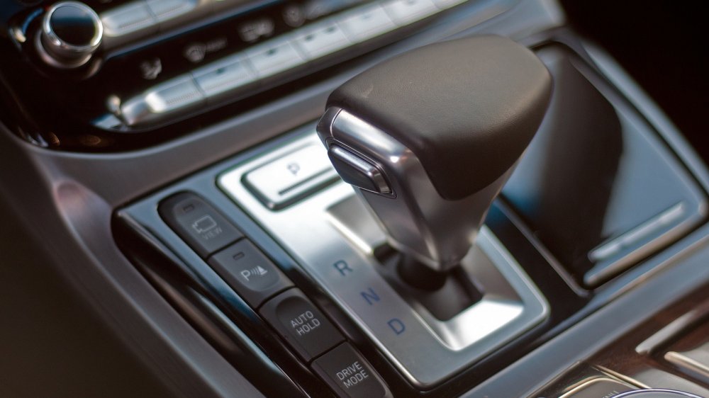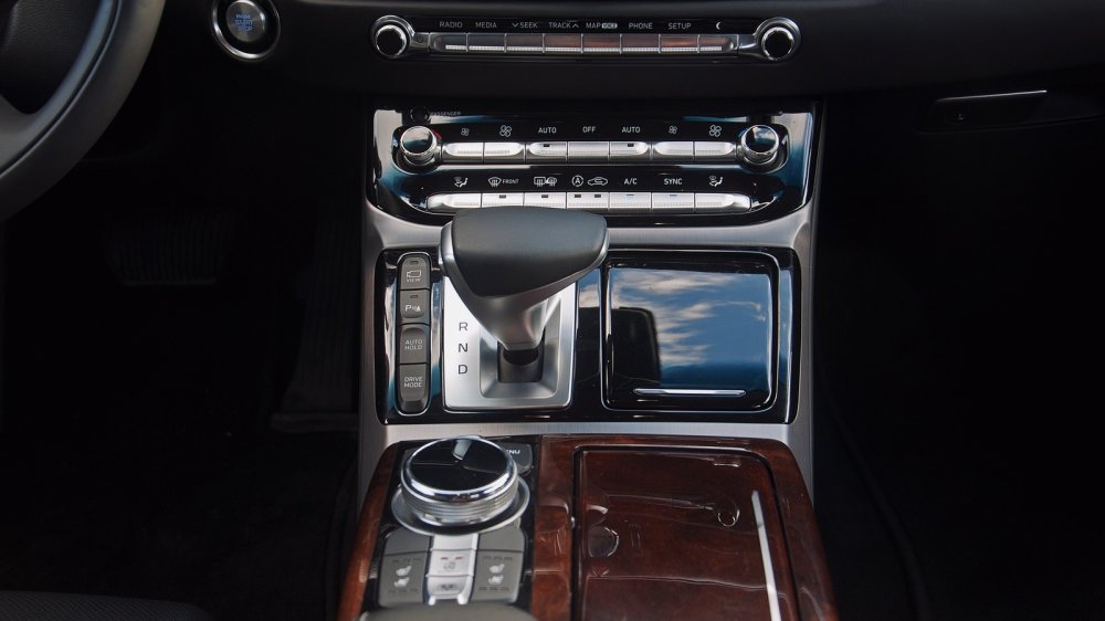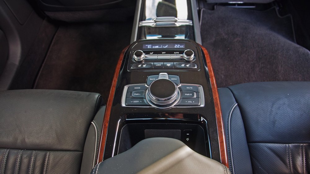 Дженезис не даёт выбора трансмиссий. Все G90 — только с восьмиступенчатыми классическими АКПП собственной разработки Hyundai и системой полного привода HTRAC. Электроника HTRAC позволяет перераспределять момент между передней и задней осями автомобиля. На практике получается приблизительно такая картина: если дорожное покрытие ровное и не скользкое, то машина едет на заднем приводе, но если появляются признаки неустойчивости, то на переднюю ось передаётся до 40% крутящего момента. Кстати, в спортивном режиме трансмиссии на задней оси появляется 90% момента, что позволяет «крутить пятаки». Но об этом чуть позже.