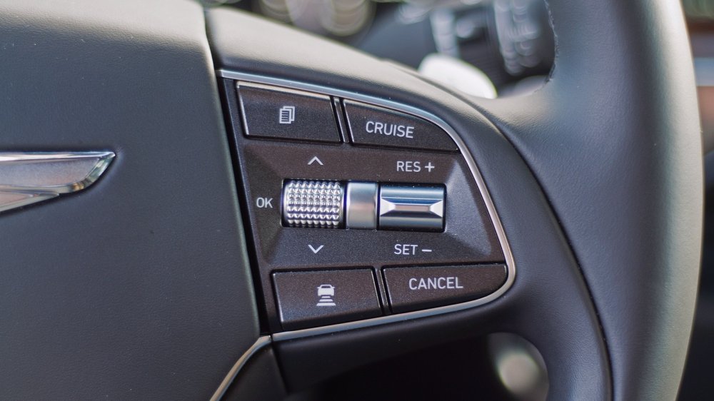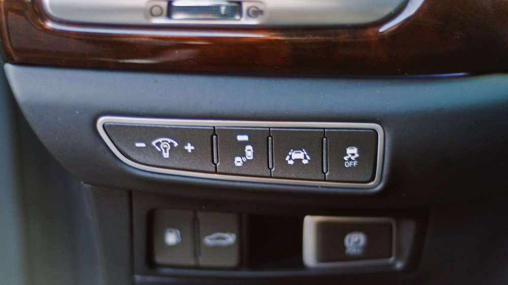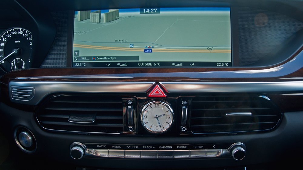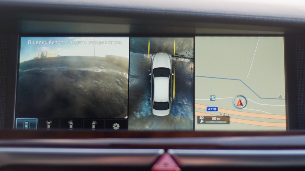 А вот полностью полагаться на ассистент удержания автомобиля на полосе движения я бы не советовал: работает он с ленцой. Уйти из полосы, может, и не даст, но посередине вести откажется. Да и нужно ли оно? Ведь стоит только ослабить хватку на руле, как Дженезис начинает паниковать и требовать схватиться за руль обеими руками. Впрочем, периодически G90 терял покоящиеся на руле обе мои руки и начинал испуганно верещать. Приходилось ласково гладить его по баранке, после чего он успокаивался.