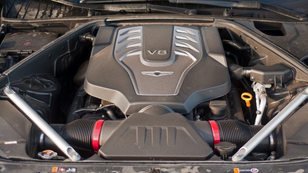 Нельзя не отметить, что атмосферные моторы отлично переваривают 92-й бензин, если, конечно, только дороговизна 95-го становится препятствием для покупки Дженезиса. Разумеется, уже нельзя ожидать от мотора прямоты чугунных предшественников. Нет, он алюминиевый, есть в нём и система непрерывного изменения фаз газораспределения, и переменная длина впускного коллектора, и по два вала ГРМ в каждой головке. Но всё же V8… Всё же атмосферный… Ценители поймут.