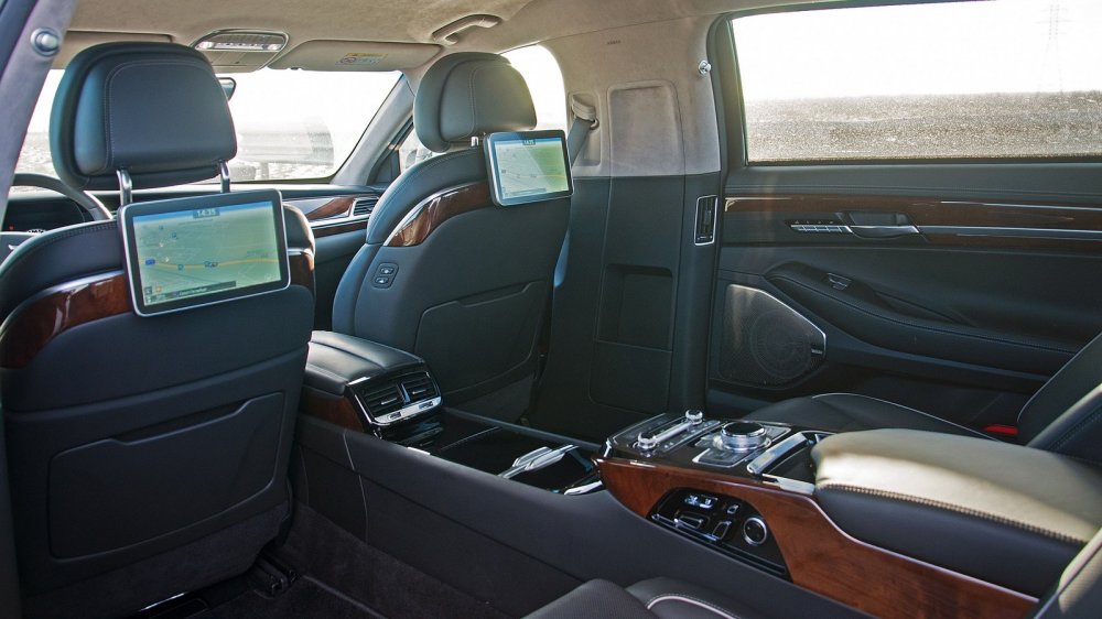 Итак, на тесте у нас не просто G90, а G90 Long. Это значит, что между передними и задними дверьми есть ещё вставка длиной 290 мм. И без того не самый маленький автомобиль в таком кузове становится просто огромным: длина его – 5 495 мм, а ширина – 1 915 мм (высота, если интересно, 1 495 мм). Так как на лимузинах у нас бедные люди не ездят, то и с комплектациями «лонга» мудрить не стали, впихнув в него всё, что можно. Чем это хорошо – расскажем чуть ниже, пока же, как и обещали, пару слов непосредственно о технике.