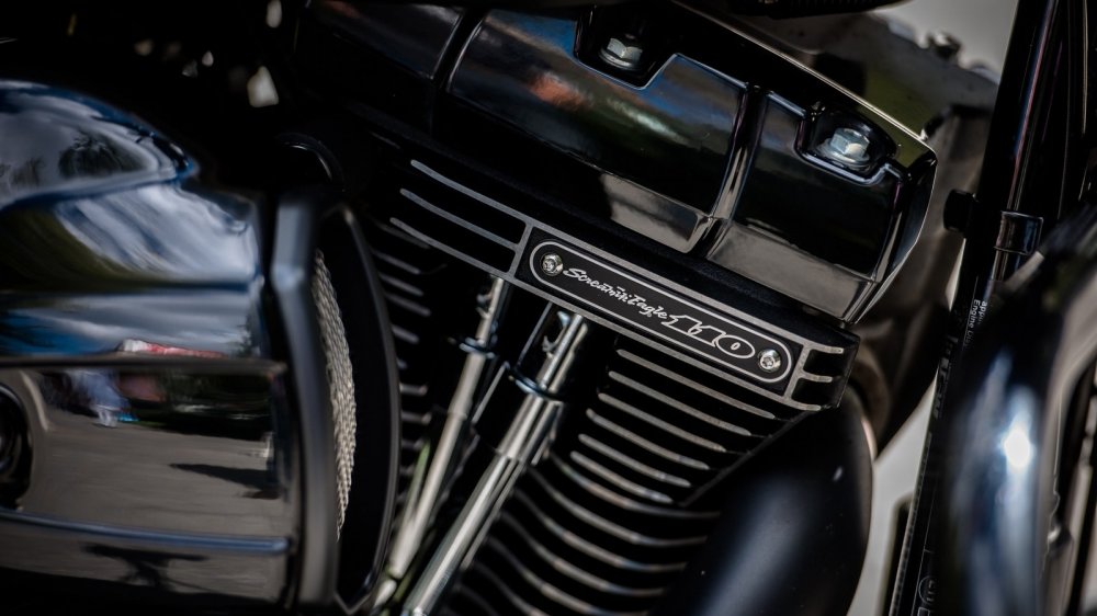 Конечно же, это мотор «не для всех» – Screamin’ Eagle 110. Думаю, многие, не очень плотно знакомые с маркой, даже и не слышали о таком. Действительно, эти моторы «распилены» из обычных Twin Cam 103 – со 103 кубических дюймов до 110 «инчей», но отличаются не только объемом, но и иными валами, поршнями и шатунами, настройками систем впрыска/зажигания, а также установленным в стоке фильтром «нулевого сопротивления». Самый большой харлеевский мотор имеет объем 1 802 куб. см. Мощность и момент тоже чуть выше, чем у базового «твин кама», и составляют 95 л. с. и 145 Нм, соответственно. «Сто третий» Twin Cam, для справки, развивает 87 сил и 126 ньютон-метров.