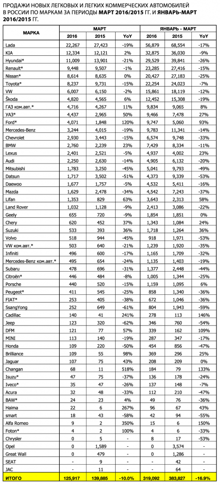 Нулевыми продажами в марте отметился не только уже привычный Opel, но и Great Wall с Chrysler. Что ж, пока планы китайского бренда по продвижению новой марки Haval не слишком-то видны в статистике АЕБ, но возможно, все еще впереди.
