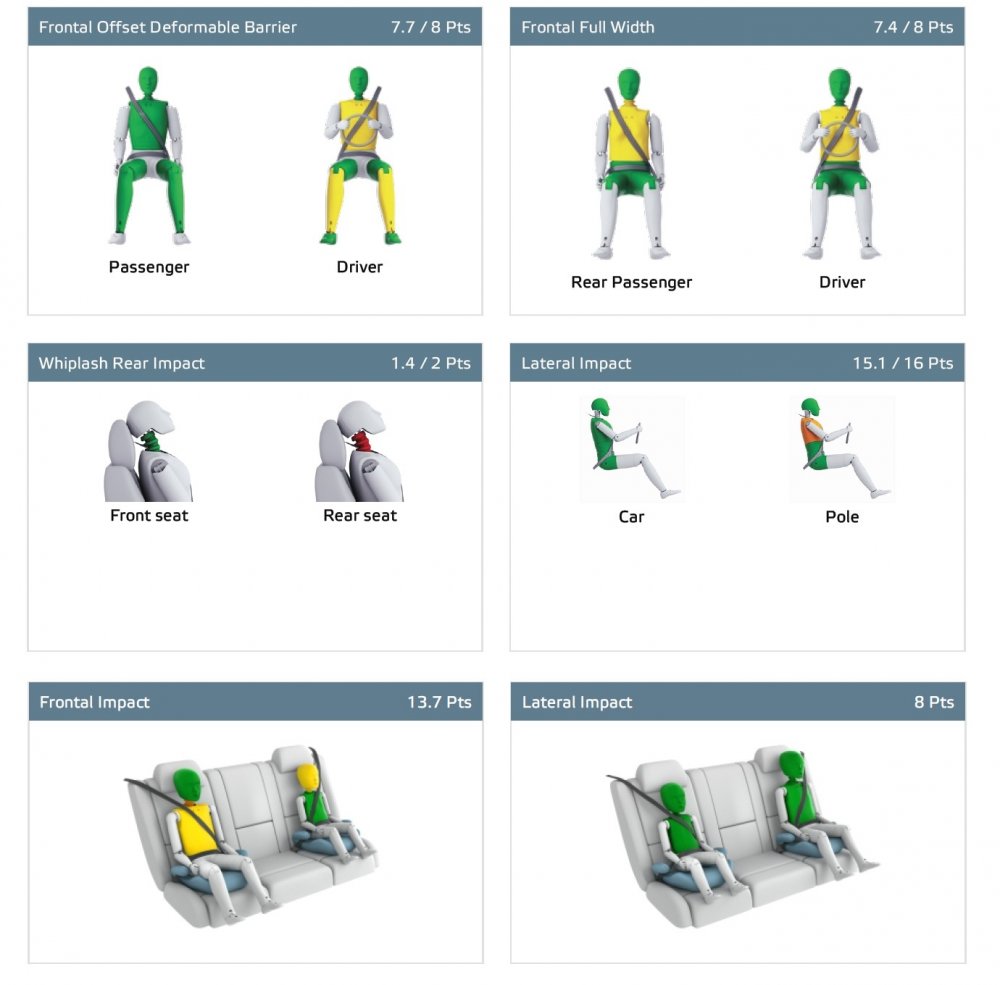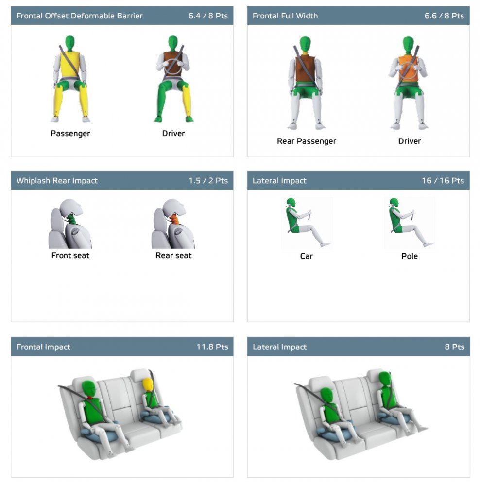Но давайте теперь по старинке взглянем на результаты краш-тестов: в них, к сожалению, далеко не всё безупречно. Особый интерес представляет новый Mercedes-Benz G-Class, ведь корни конструкции этого внедорожника уходят в середину 70-х годов прошлого века, и прежде «гелик» на тестах Euro NCAP никогда не был. Увы, тяжёлая рамная машина, скомпонованная по допотопным армейским принципам, плохо справилась с фронтальными ударами. При столкновении на скорости 64 км/ч с установленным с 40-процентным смещением сминаемым барьером грудь водителя-манекена зафиксировала высокий коричневый уровень нагрузок, означающий гарантированное получение тяжёлых травм. Столь же высокие нагрузки были зафиксированы на груди пассажира, сидевшего на заднем сиденье во время фронтального удара о стену на скорости 50 км/ч. К детишкам G-Class тоже недружелюбен: при фронтальном ударе на скорости 64 км/ч шеи кукол, изображающих 6- и 10-летних пассажиров, зафиксировали красный, смертельно опасный уровень нагрузок. А вдобавок всего лишь на «троечку» (оранжевый уровень опасности) была оценена геометрия подголовников заднего сиденья. В общем, при старой системе начисления рейтинга G-Class вряд ли получил бы пять звёзд.