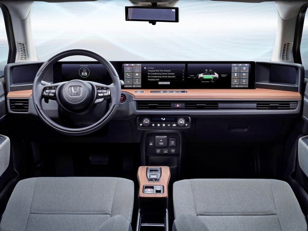 Интерьера куда сложнее: в его угловатости в сочетании с текстильной мягкостью отделки мы видим традиции японских кей-каров. Деревянные полки на передней панели и «тумбочке» между передними креслами подчёркивают экологичность модели, а целых пять мониторов, выстроенных во всю ширину салона, как бы намекают, что модель адресована молодым покупателям, которые с гаджетами на «ты». Те экраны, что по краям, транслируют картинки с камер заднего вида, а средние отвечают за приборы, навигацию и развлечения. Под потолком есть шестой экран: он встроен в салонное зеркало заднего вида и может транслировать изображение с установленной на корме камеры. Любопытно, что блок климат-контроля выполнен по старинке, с кнопками, ручками и узким монохромным дисплейчиком, а под ним находится целый букет разнокалиберных зарядных разъёмов.