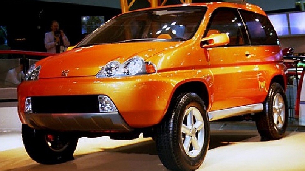 И действительно, трёхдверный концепт имел всего 3 950 мм в длину, 1 780 мм в ширину и 1 775 мм в высоту при колёсной базе в 2 360 мм. Что интересно, в нём хоть и можно было усмотреть схожесть с тем самым макетом дизайнера Белякова почти десятилетней давности, но гораздо меньшую, чем у получившегося в итоге HR-V, вставшего в 1998-м на конвейер. Хотя по-крупному поменялось всего несколько деталей: упростилась светотехника, колёса стали меньше, исчез ряд подштамповок вроде выпуклой ниши запасного колеса двери, а сама дверь стала не открывающейся, а подъёмной. Кроме того серийную машину пришлось сделать длиннее, уже и ниже: у HR-V длина равна 4 010 мм, ширина 1 695 мм, а высота 1 580 мм при колёсной базе в 2 350 мм. Для сравнения – запущенная в 2002-м Niva второго поколения была немного крупнее по всем параметрам, а колёсная база получилась больше ровно на «сотку»: 4 056 x 1 800 x 1 690, база 2 450 мм. Да, габариты схожие, но вот автомобили, как и их судьбы, совершенно разные.