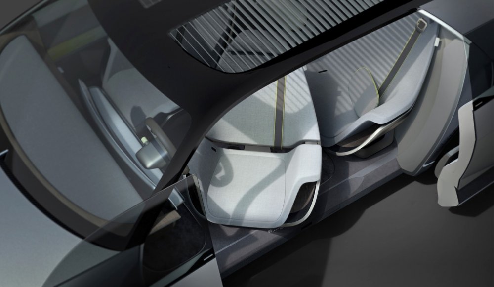 Боковые двери-слайдеры разъезжаются в разные стороны, открывая беспрепятственный доступ (центральных стоек нет) в салон-гостиную. Сиденья в нём напоминают шезлонги на деревянных каркасах, передние могут поворачиваться вокруг вертикальной оси, чтобы посадка свелась к простому опусканию пятой точки на мягкую обивку, словно вы пришли домой и упали в объятия любимого кресла. Домашний уют подчёркивает густое ковровое покрытие пола, большое количество натурального дерева в отделке и естественный свет, льющийся сквозь прозрачную крышу.
