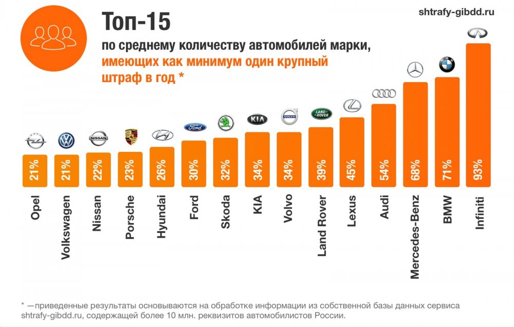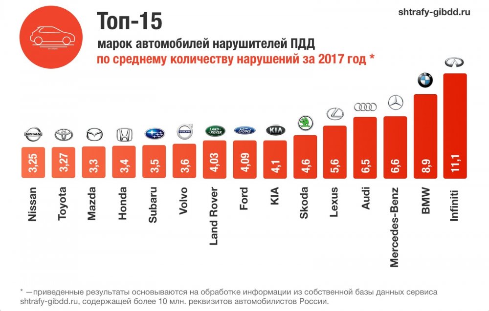 Согласно полученным данным, в пятёрку самых «штрафоопасных» марок вошли премиальные японские и немецкие бренды: Infiniti, BMW, Mercedes-Benz, Audi и Lexus. Водители машин в среднем получают от 5 до 11 постановлений о административном правонарушении за год. Примерно по 4 штрафа у владельцев моделей Skoda, Ford, Land Rover и Volvo. Нарушают ПДД также водители Subaru, Honda, Mazda, Toyota и Nissan.