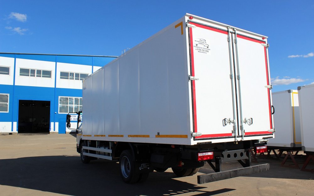 Настил пола – бакелитовая транспортная фанера. Отбортовка – плакированный металл белого цвета. Задние распашные двери имеют угол открывания до 270 градусов, оснащены Т-образными фиксаторами дверей в открытом положении и трёхлепестковыми резиновыми уплотнителями.
