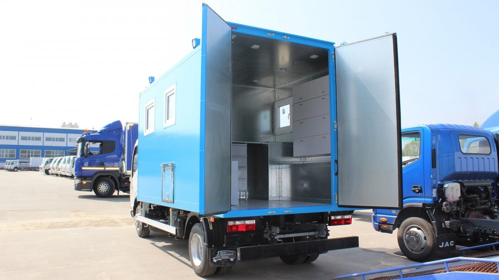 Автомастерская также создана на базе шасси JAC N-75. Фургон имеет два отсека: пассажирский и отдел мастерской. Обшивка снаружи изготовлена из армированного стекловолокном пластика. отделка пассажирского отсека выполнена из ламинированной фанеры, а мастерской — из оцинкованного металла.