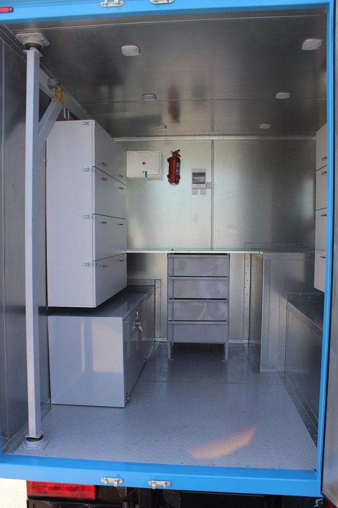 В мастерской присутствуют отсеки для дизель-генератора и инструментов, два ящика с доступами с наружной стороны фургона, верстак и навесные боксы для хранения, кран-балка с грузоподъёмностью 250 кг, светодиодное освещение и напольное покрытие из стального профнастила.