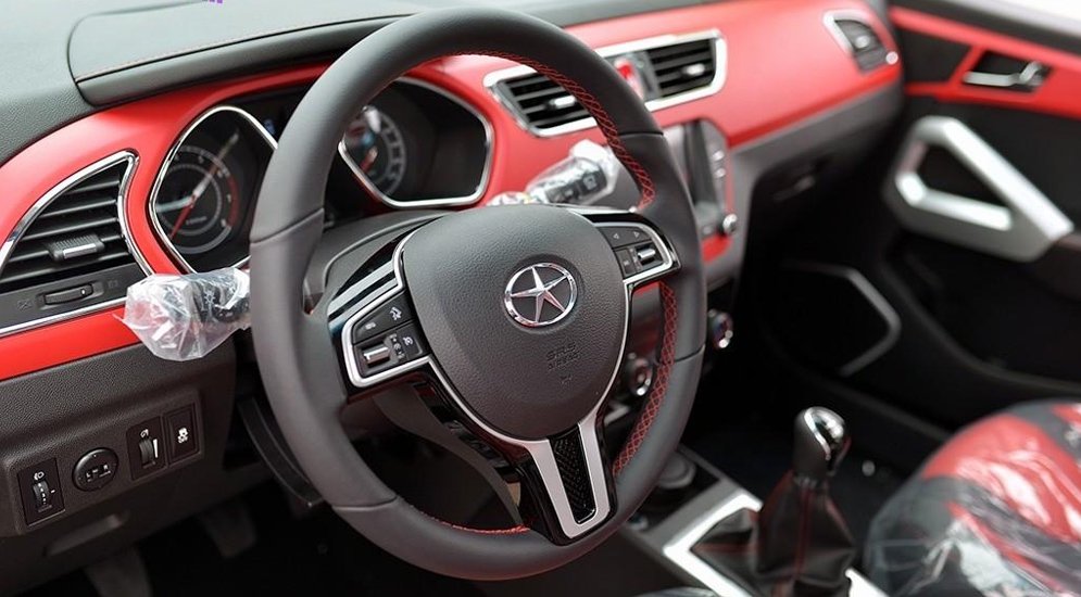 Интерьер JAC S2 иначе как "веселеньким" не назовешь. Приборная панель, дверные карты и сиденья украшены яркими вставками в цвет кузова. На пухленькую "баранку" вынесены клавиши управления мультимедийной системой, чей сенсорный экран украшает центральную консоль.