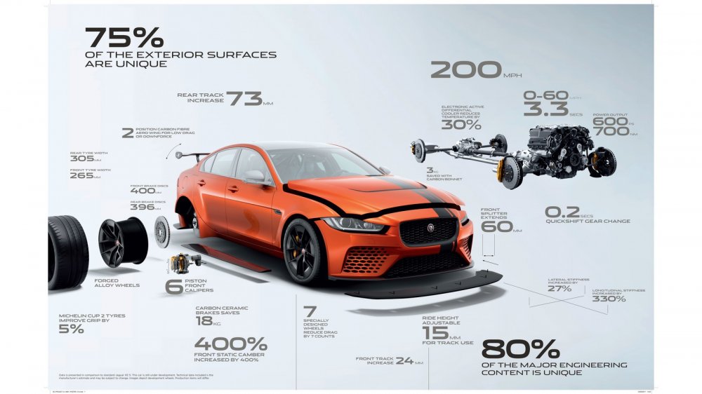 В электронный блок управления двигателем было "зашито" новое программное обеспечение, что сделало седан XE SV Project 8 не только быстрее, но и улучшило его управляемость, отметил менеджер SVO Дэвид Пук. Напомним, седан укомплектован наддувным AJ-V8 объемом 5,0 литра с отдачей 600 л.с. и 700 Нм крутящего момента. С места до 100 км/ч «четырехдверка» выстреливает за 3,5 секунды и разгоняется до 322 км/ч.