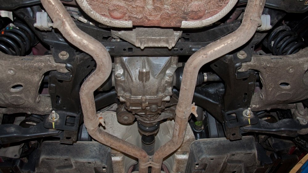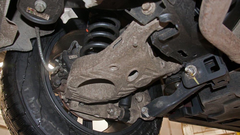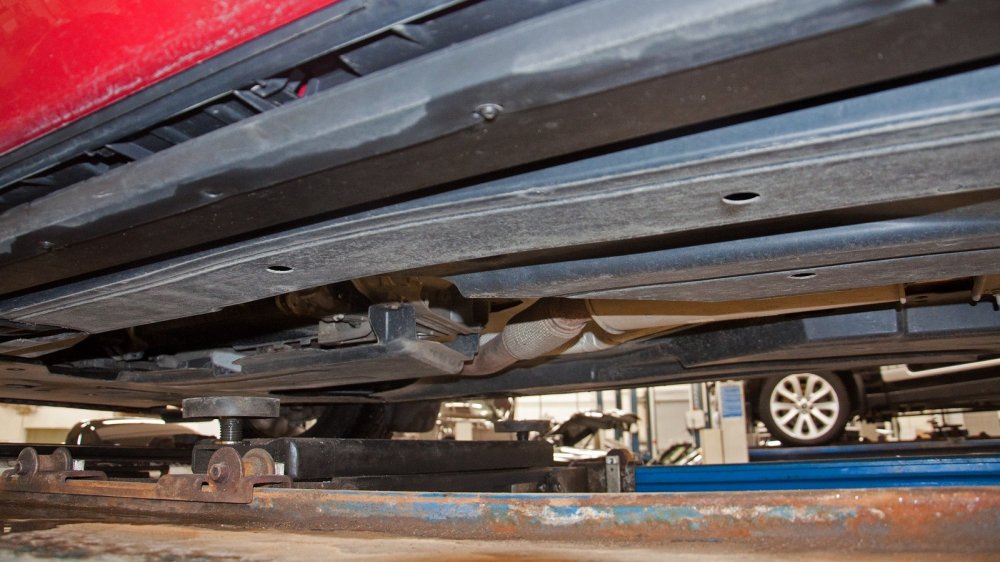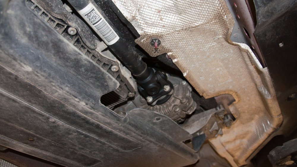 Пока машина стоит на подъёмнике, обратим внимание на ещё одну деталь. В виде штатной защиты — пластиковый пыльник. Если хотите ездить на этом кроссовере где-то, где нет асфальта, было бы очень хорошо поставить нормальную защиту. Сделать это можно и у дилера.