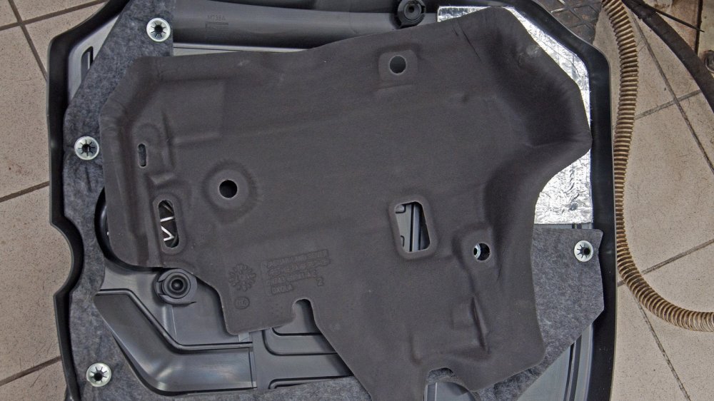 На нашей машине стоит самый популярный из всех возможных на F-PACE моторов — двухлитровый турбодизель AJ200. Это рядная “четвёрка” с алюминиевым блоком, алюминиевой же головкой и цепным приводом ГРМ. Двигатель выдаёт всего 180 л.с., но имеет хороший дизельный крутящий момент в 430 Нм. Ещё даже не начав знакомиться с расценками на его обслуживание, отмечаю качество его кожуха. Я бы сказал, монументальность: два слоя, хорошие материалы… Снял я его за пару секунд (он стоит на защёлках), а два механика его потом ставили назад чуть дольше. Ну, что ж… Мне надо было видеть этот мотор без крышки сверху, извините.