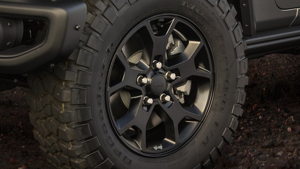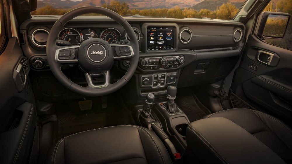 Обрамление головной оптики, внутренняя часть отверстий радиаторной решетки и буксировочные крюки тоже окрашены в черный глянец. В стандартное оснащение новинки входят боковые рейлинги Rubicon, тогда как боковые подножки Sahara доступны за дополнительную плату. Внедорожник в базе получает жесткий верх под цвет кузова, но предлагаются также опциональные двойной и Sky One-Touch с электроприводом.