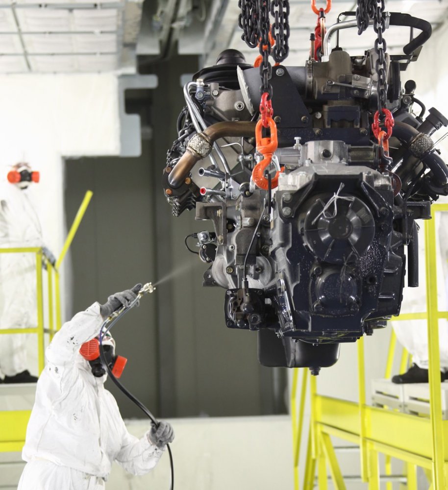 Сообщается, что каждый маляр красит свой участок силового агрегата, так как рабочие места в окрасочной камере расположены в шахматном порядке. Это позволяет обеспечивать нужный темп и безопасность процесса, делает окраску равномерной.