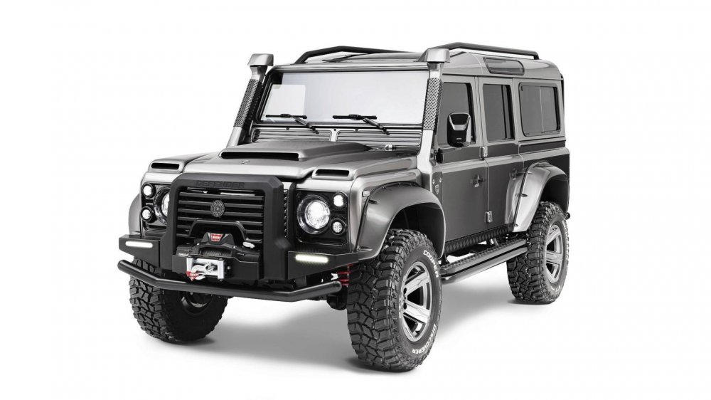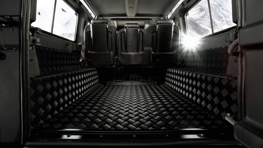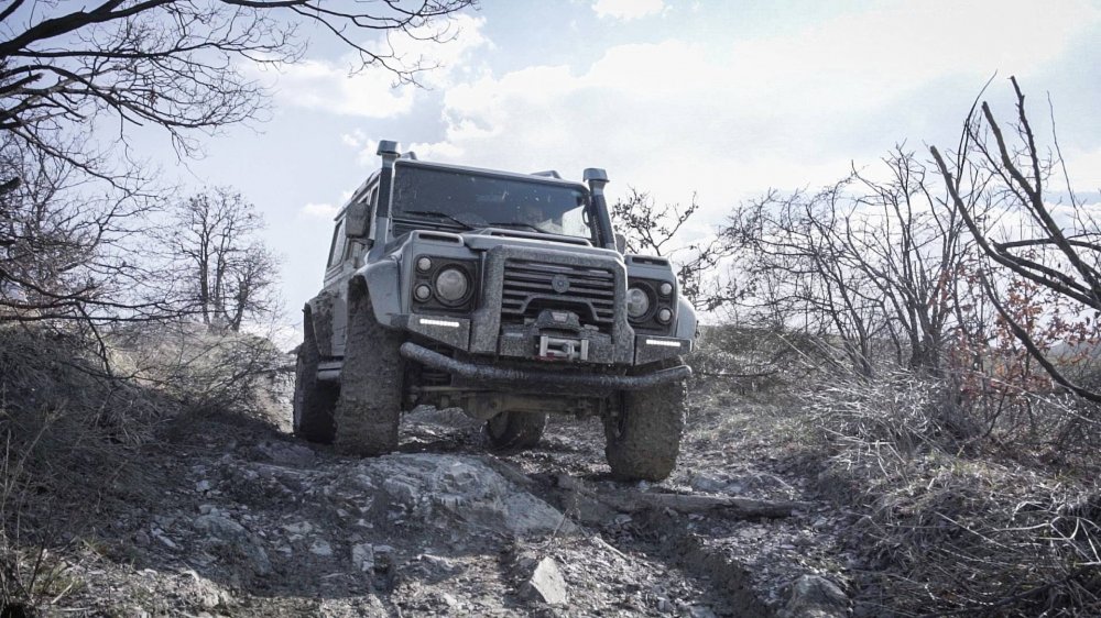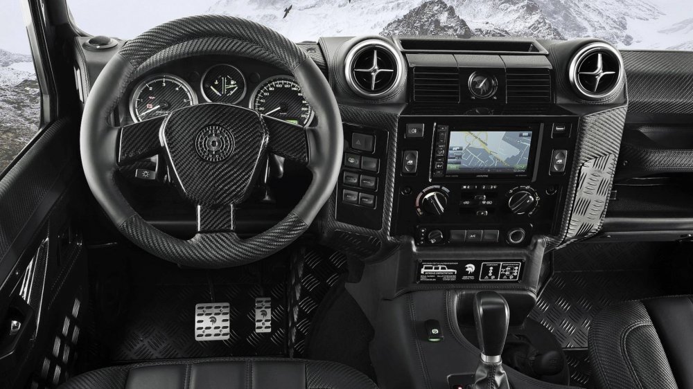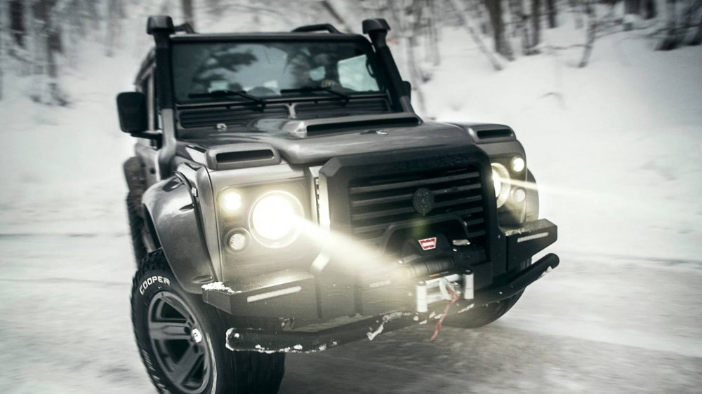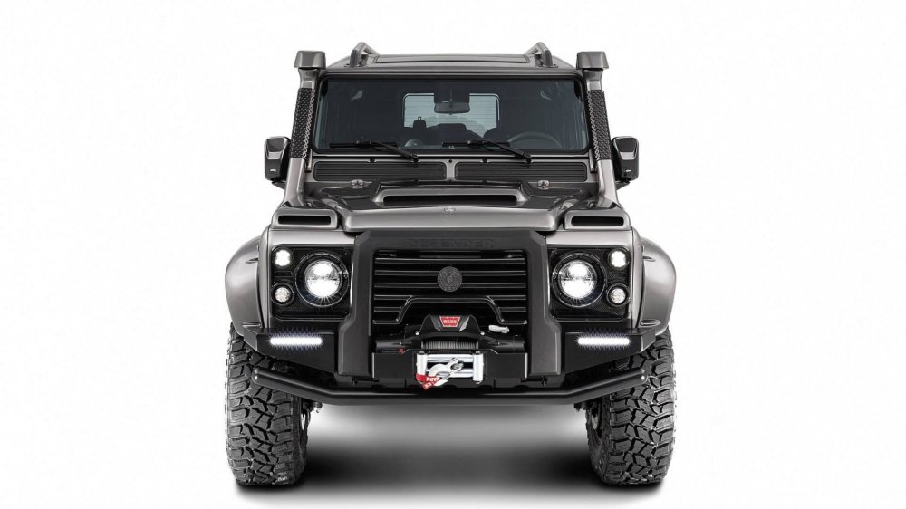 Апгрейды экстерьера включают: расширение колесных арок, капот, обрамление головной оптики и радиаторная решетка – все выполнено из карбона. Вместо стандартных бамперов установлены усиленные, добавлена защита днища, дополнительный светодиодный свет, усиленные передняя и задняя точки буксировки, подножки и стальные рейлинги на крыше.