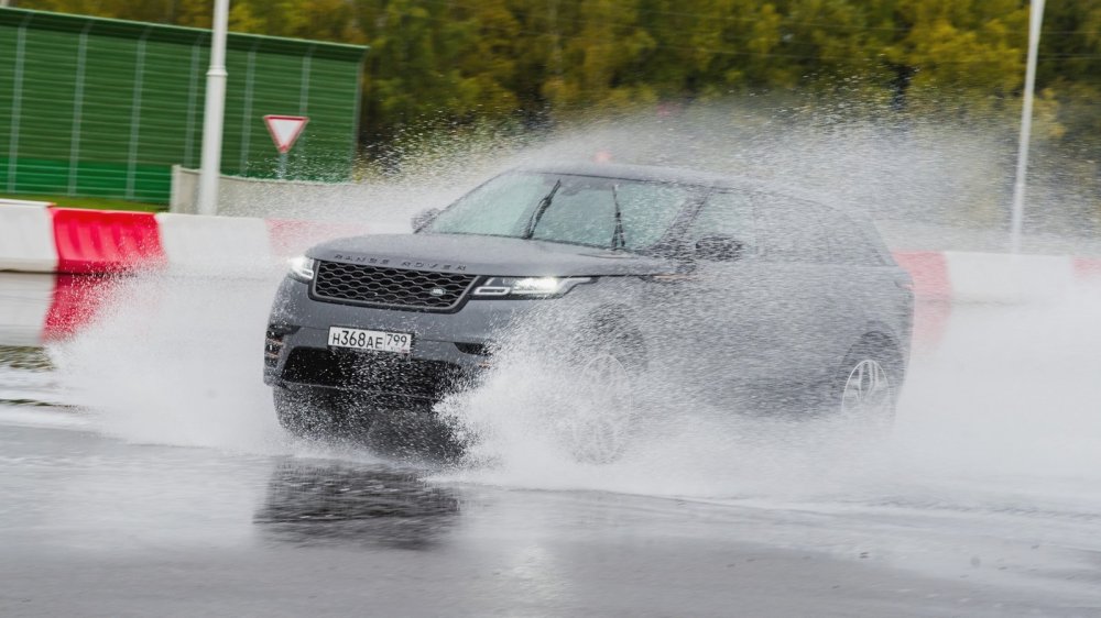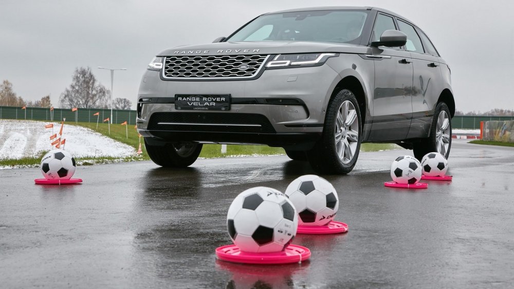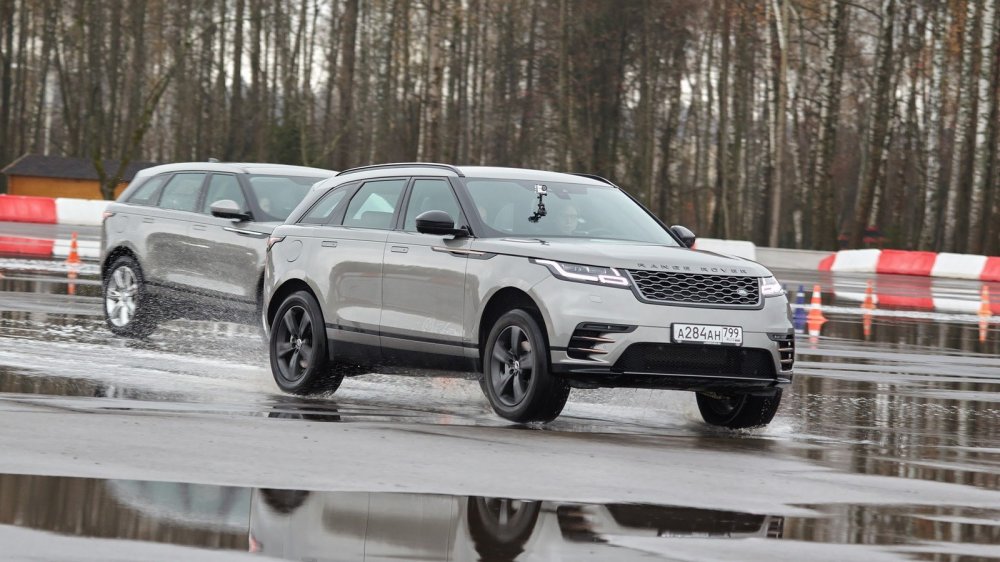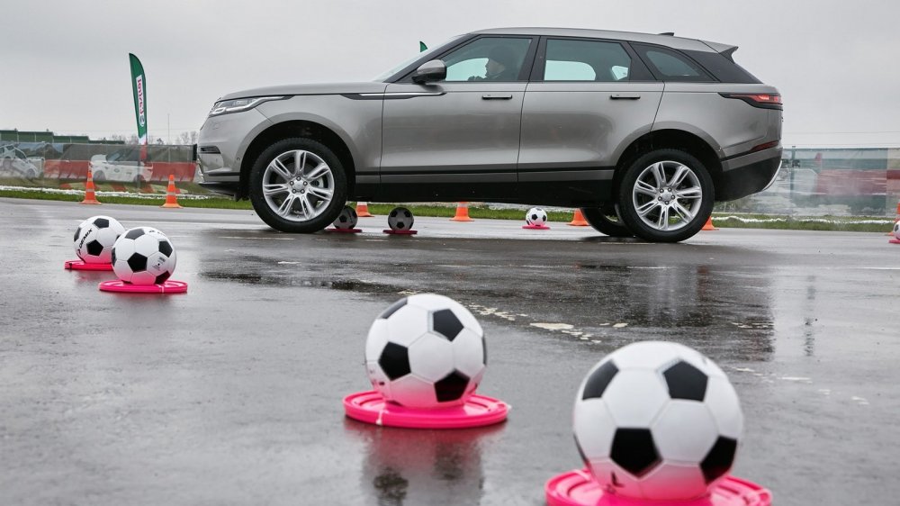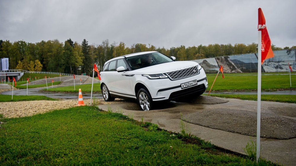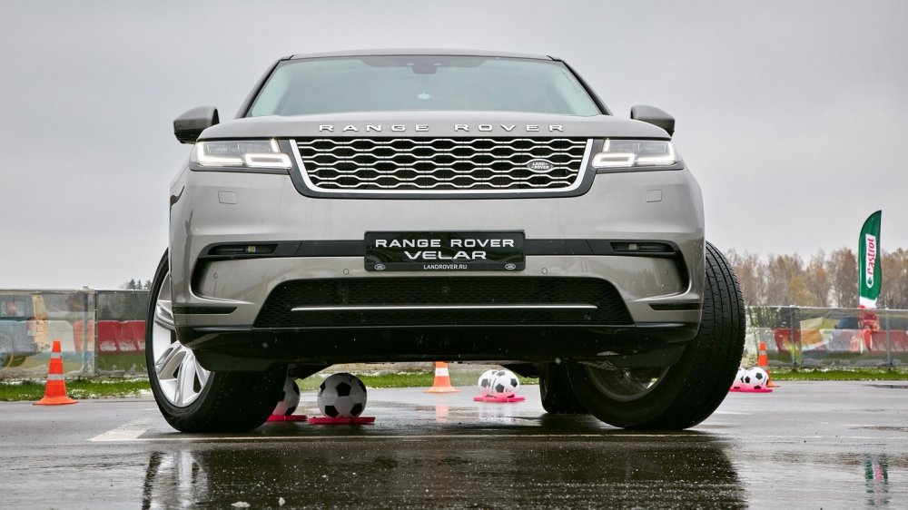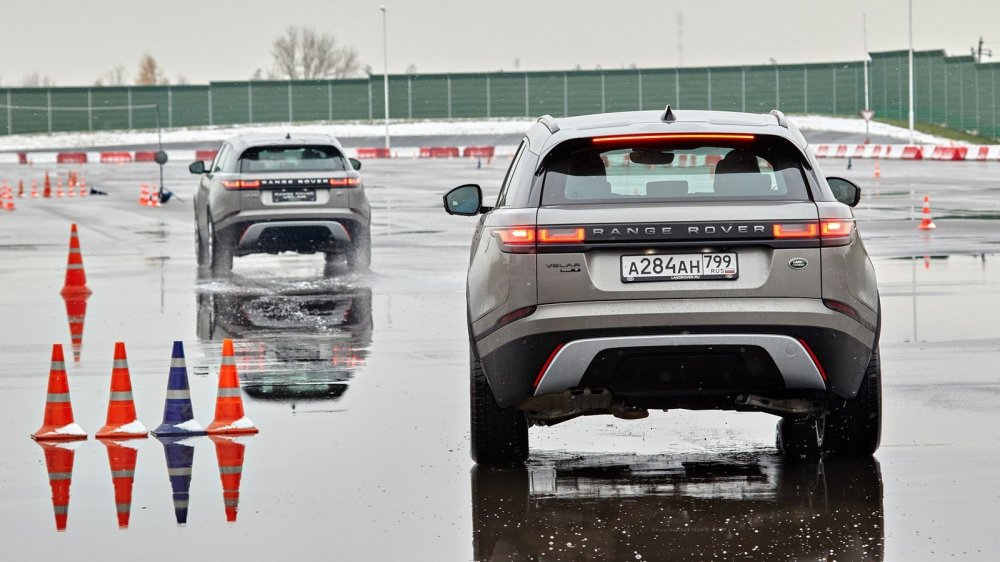 Невольно вспомнилось точно такое же мероприятие, где я выполнял точно такие же упражнения на Jaguar F-Pace. Сразу чувствуется, что Velar кренится чуть больше, но вот на точность управления это почти не влияет: это работают системы динамического распределения крутящего момента на колесо, управления тягой Intelligent Driveline Dynamics, и система управления подвеской Adaptive Dinamics, которая 500 раз в секунду считывает данные о параметрах движения автомобиля, точно регулируя жесткость амортизаторов. В итоге на скорости 60 километров в час «переставка» выполняется без торможения, на ровном газу, просто двумя короткими движениями рулем. Но если надо интенсивно работать газом — то «всегда пожалуйста». Дизель Ingenium удивительно отзывчив, а 8-ступенчатый автомат позволяет забыть о том, что у вас в трансмиссии вообще есть такой агрегат.