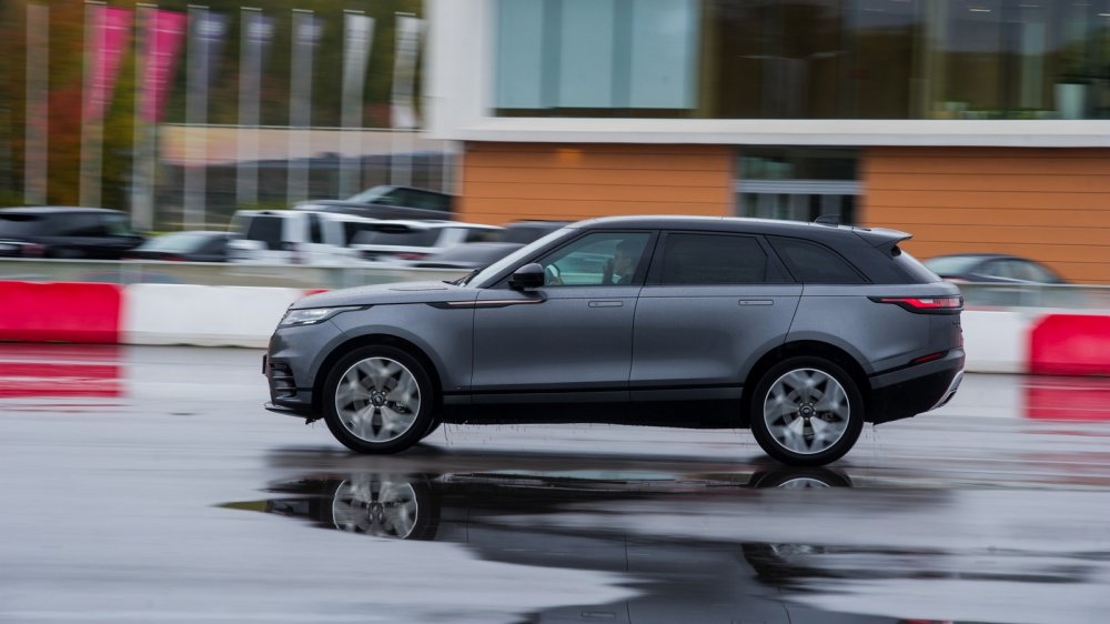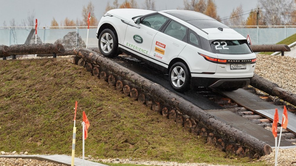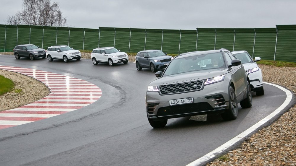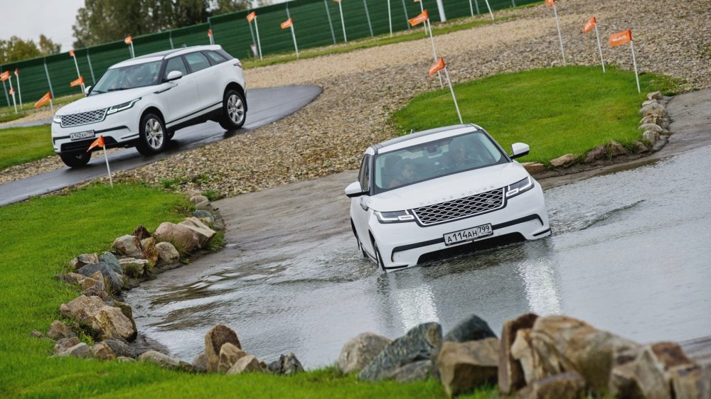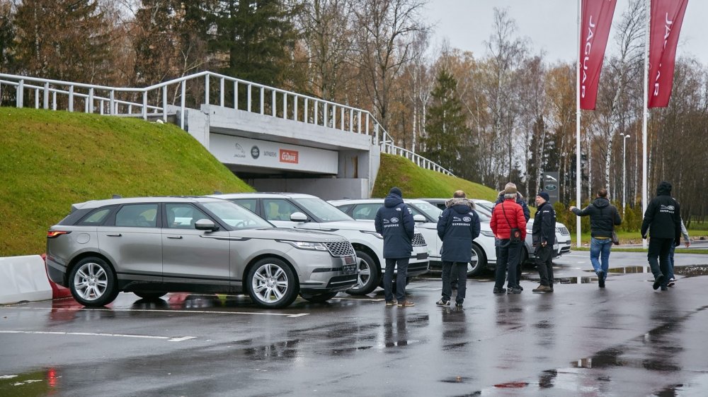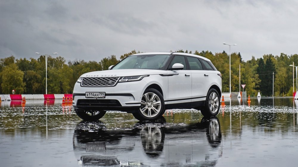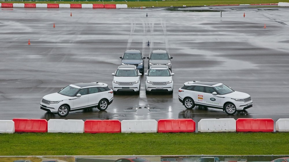 Невольно вспомнилось точно такое же мероприятие, где я выполнял точно такие же упражнения на Jaguar F-Pace. Сразу чувствуется, что Velar кренится чуть больше, но вот на точность управления это почти не влияет: это работают системы динамического распределения крутящего момента на колесо, управления тягой Intelligent Driveline Dynamics, и система управления подвеской Adaptive Dinamics, которая 500 раз в секунду считывает данные о параметрах движения автомобиля, точно регулируя жесткость амортизаторов. В итоге на скорости 60 километров в час «переставка» выполняется без торможения, на ровном газу, просто двумя короткими движениями рулем. Но если надо интенсивно работать газом — то «всегда пожалуйста». Дизель Ingenium удивительно отзывчив, а 8-ступенчатый автомат позволяет забыть о том, что у вас в трансмиссии вообще есть такой агрегат.