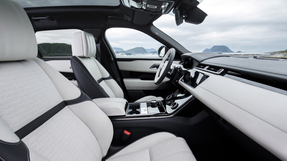 То, что Velar существенно крупнее, чем Evoque, видно, что называется, невооруженным глазом: как-никак, разница в длине превышает полметра! Различия по габаритам с Range Rover Sport не столь очевидны: Velar короче старшего братца на 69 мм и чуть уже, на 41 мм. А вот по высоте Velar уступает ему 115 мм, и это видно. По этому параметру Velar ближе к Evoque, да и силуэты у них похожи. Собственно, несмотря на размеры, и по снаряженной массе Velar куда ближе к Evoque, чем к Range Rover Sport. Впрочем, у Velar есть еще один ближайший родственник, с которым он практически не различается ни по габаритам, ни по массе. Более того: он имеет точно такую же колесную базу. Вы, конечно же, поняли, что речь идет про Jaguar F-Pace, с которым Velar делит платформу iQ(Al). Они действительно похожи: по внутренней архитектуре, по посадке водителя… Но вот философия этих автомобилей все-таки разная. Я почувствовал это очень четко, тем более, что презентация F-Pace проходила на том же самом полигоне, и журналистам были предложено выполнить точно такие же упражнения: змейки, переставки… А вот на внедорожную часть полигона F-Pace все-таки не пустили (хотя я уверен, что многие препятствия он прошел бы без особых проблем), и все из-за этой самой разницы в концепции. К этому вопросу мы еще вернемся, а пока что я, пожалуй, начну со своих впечатлений от салона…