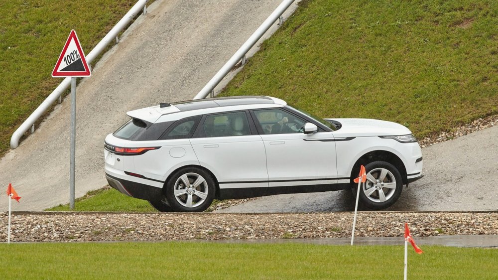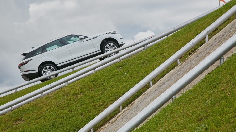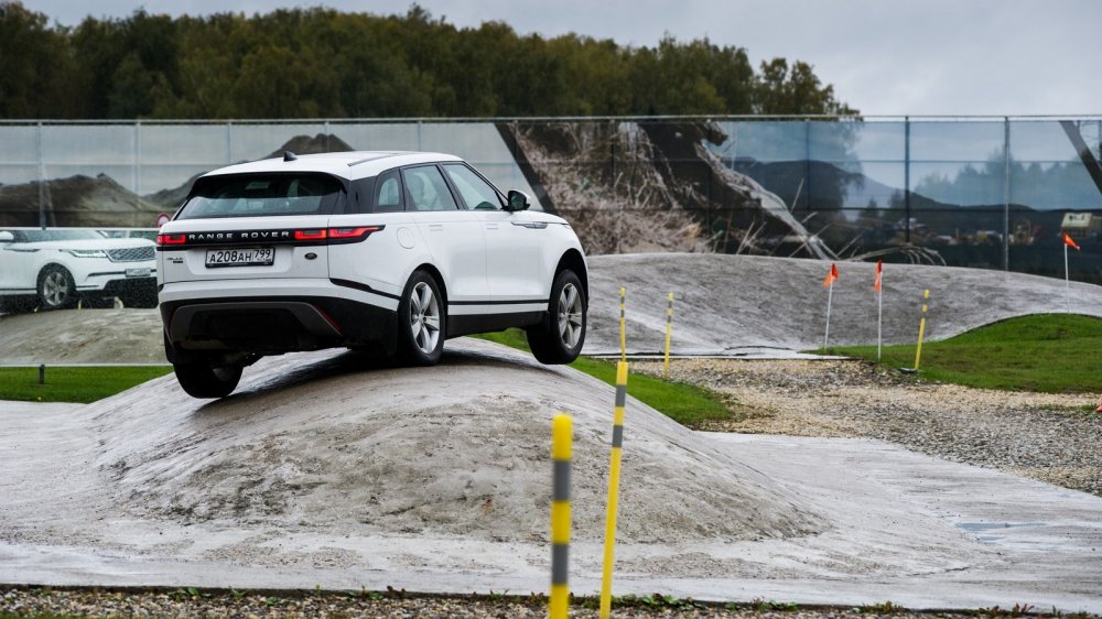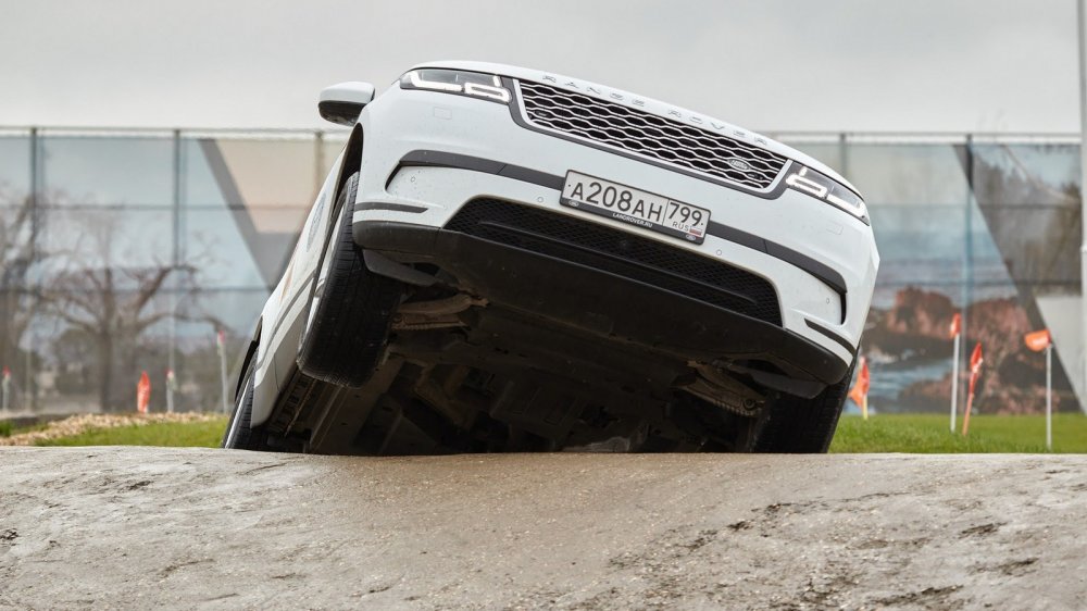 Помогали камеры и на внедорожной трассе, позволяя заглянуть за перегиб рельефа и убедиться, что массивный капот Velar смотрит именно туда, куда нужно. Собственно, так уж получилось, что свое знакомство с Velar я начал именно с комплекса внедорожных препятствий. Что я могу сказать? Land Rover остался верен себе и своей системе ценностей….