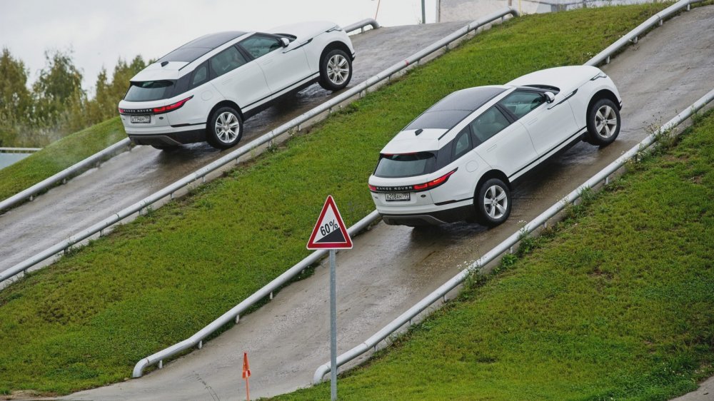 На внедорожной трассе я ездил на бензиновой версии с 300-сильным бензиновым V6, а вот «змейки» и «переставки» крутил на автомобиле с 240-сильным дизелем. Наоборот было бы, наверное, несколько органичней, но и так хорошо получилось. Во всяком случае, я убедился, что крутящий момент бензинового мотора позволяет на ровном газу преодолеть и 60-процентный подъем, да и проезд по диагонали через бруствер, равно как движение по переменным препятствиям не потребовал ювелирной работы газом. Не спеши, езжай аккуратно, и Terrain Response все сделает сам. Вы даже избавлены от необходимости оценивать трассу и выбирать режим: нажимаете на иконку с надписью Auto, и система сделает выбор за вас. При этом внутри — никакой тряски и резких ударов. Собственно, именно ездового комфорта мы и ждем от любого автомобиля семейства Range Rover, и Velar не обманывает ваших ожиданий.