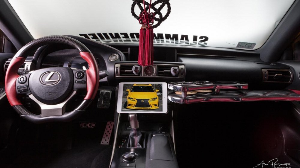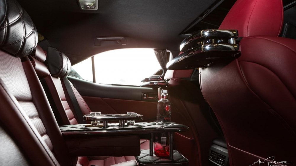 Кстати, красные диски смотрятся особенно эффектно, благодаря комплекту для занижения подвески Accuair Airride. Кроме того, диски гармонично перекликаются с акцентами внутренней отделки салона, выполненными из кожи. На самом деле с интерьером была проделана масштабная работа, в чем можно убедиться, взглянув на фото.