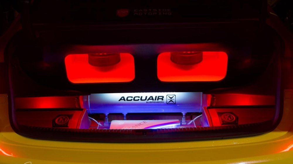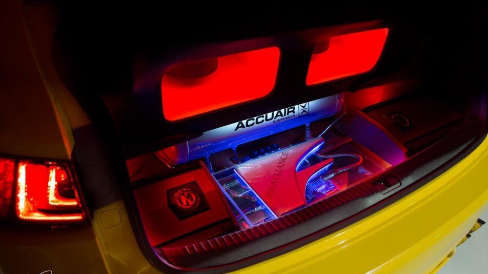 В багажнике установлена звуковая система, контейнер для сжатого воздуха Accuair Airride и выполнена яркая светодиодная подсветка всего этого дела. Набор кузовного обвеса включает передний спойлер, боковые юбки, внушительный задний диффузор и спойлер на крышке багажника.